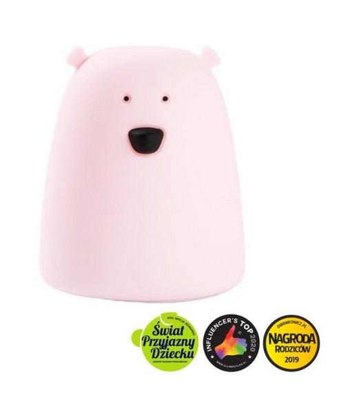 Lampka MIŚ MAŁY Rabbit & Friends ma charakterystyczny i urokliwy kształt misia o niewielkich, sterczących uszkach, przenikliwych oczkach, zgrabnym nosku i okrągłym brzuszku. Jest cała różowa, tylko oczka i nosek są czarne. Lampka zapewni kojące towarzystwo w trakcie wieczornych zabaw i spokojny, bezpieczny sen. W godzinach nocnych ułatwia doglądanie najmłodszych pociech, zmianę pieluch i karmienie piersią. Nieco starszych dzieciom posłuży jako przenośne oświetlenie w drodze przez ciemny korytarz do łazienki lub sypialni rodziców. Paleta kolorów lampki stworzy w pomieszczeniu niepowtarzalny, harmonijny, wypełniony miękkim światłem ciepły klimat. Lampka działa na poklepywanie. Dodatkową funkcją jest możliwość ustawienia automatycznego wyłączenia lampki po 1 godzinie. Obsługa lampki jest intuicyjna - nawet małe dziecko poradzi sobie bez problemu. Lampka Rabbit & Friends nie ma ostrych krawędzi ani się nie nagrzewa (dzięki technologii LED). Zasilana jest poprzez baterie: 3 x AAA. Wykonana jest z wysokiej jakości, certyfikowanego, bezpiecznego, wolnego od BPA, silikonu. Lampka została doceniona i otrzymała kilka nagród: XVIII edycji konkursu Świat Przyjazny Dziecku organizowanej przez Komitet Ochrony Praw Dziecka, III edycji plebiscytu Influencers Top 2020 oraz prestiżowego konkursu Zabawka Roku, Nagroda Rodziców 2019 portalu zabawkowicz pl. Cechy: