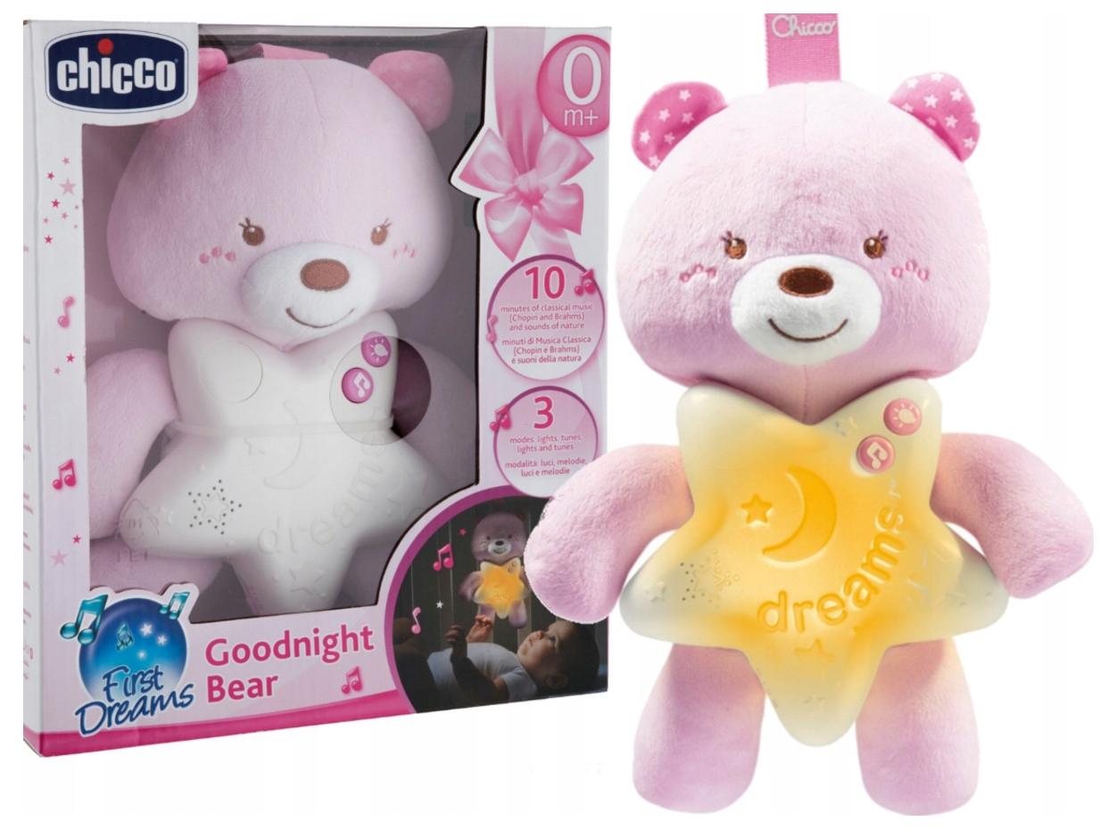 Miś na dobranoc marki Chicco został specjalnie zaprojektowana, aby ułatwić zasypianie każdemu niemowlakowi. Jego brzuszek kryje niezwykłe atrakcje - po naciśnięciu świeci oraz puszcza melodyjki , które będą towarzyszyć dziecku w drodze do krainy snu! Pomogą one maluszkowi się zrelaksować i poczuć bezpiecznie, a dyskretne i spokojne melodie nie będą go rozpraszać.