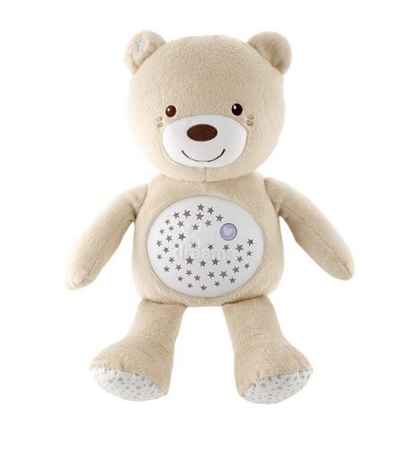 Miękki, delikatny i miły w dotyku pluszak z ukrytym w brzuszku mechanizmem, dzięki któremu czas, który dziecko spędza z maskotką, upływa przy akompaniamencie przyjemnej muzyki i efektów świetlnych. Przez brzuszek misia emitowane są efekty świetlne: intensywna, rozgwieżdżona poświata, delikatny blask, wewnętrzne światełko, idealne jako nocna lampka. Dźwięki, których maluch słucha nieprzerwanie przez 30 minut, to muzyka klasyczna (Bach i Beethoven), muzyka nowoczesna, soft rock, jazz oraz dźwięki natury.