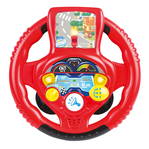 Mistrz Kierownicy to symulator jazdy dla dzieci w wieku od 2 do 5 lat. Mali miłośnicy nauki jazdy mają tu wszystko jak w prawdziwym aucie. Kierownica uruchamiana jest przy pomocy specjalnego włącznika w kształcie kluczyka. Zabawka wydaje odgłosy imitujące dźwięki prawdziwego silnika. Gotowi do drogi. Ruszamy!!! Ma dźwignię zmiany biegów, która działa w 3 trybach: N – luz S – motor jedzie F – autko przyspiesza Samochodzik ze świecącymi reflektorami porusza się po ruchomym ekranie. Dzięki klaksonowi dziecko może trąbić, ostrzegając niesfornych kierowców. Kierownica ma regulowaną podstawkę. Ruchome elementy korzystnie wpływają na koordynację ruchową, zdolności poznawcze i myślenie przyczynowo-skutkowe. W trakcie zabawy dziecko uczy się – poznaje nowe kształty, kolory, dźwięki. Czynności naciskania, popychania, przekręcania zwiększają precyzję ruchów rączek. Sygnały dźwiękowe i światełka stymulują słuch i wzrok dziecka. Wiek: 2 – 5 lat Zasilanie: 3 x baterie AAA 1,5 V – załączone baterie testowe