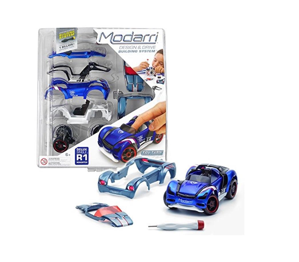 Zestaw Modarri Delux R1 zawiera 13 wymiennych części miedzy innymi: niebieska maska i błotniki oraz czarna rama kabrioletu Roadster; dodatkowe części to złożenia samochodu sportowego to srebrno-niebieska maska i srebrno-niebieskie błotniki; siedzenie, 4 koła, 2 zawieszenia. Opakowanie zawiera śrubokręt.
