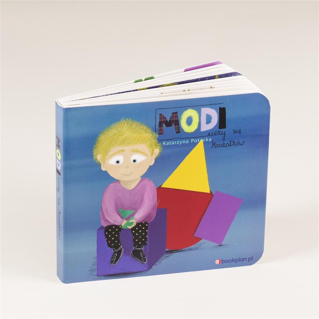 „Modi” to seria książeczek o kilkuletnim chłopcu i jego psie mopsie. Bohaterowie przeżywają mnóstwo przygód, przy okazji poznając świat. Sympatyczny bohater wraz ze swoim pieskiem przeprowadzi malucha przez naukę liczenia, kolorów i kształtów, a nawet zabierze ze sobą do przedszkola! Po takim treningu każde dziecko z uśmiechem na twarzy zechce pójść w jego ślady! Modi tym razem wyrusza w podróż w poszukiwaniu kształtów. Wybierz się w podróż pełną zabawy razem z Modim. Przecież kształty są wszędzie! Katarzyna Potocka – absolwentka Akademii Sztuk Pięknych w Warszawie na Wydziale Grafiki. Na co dzień zajmuję się filmem animowanym oraz ilustracjami. Pod koniec 2022 roku wydała serię książeczek dla dzieci „Modi”, które są w całości napisane i ilustrowane przez autorkę. Inspiracją do stworzenia książeczek jest jej syn i piesek mops.
