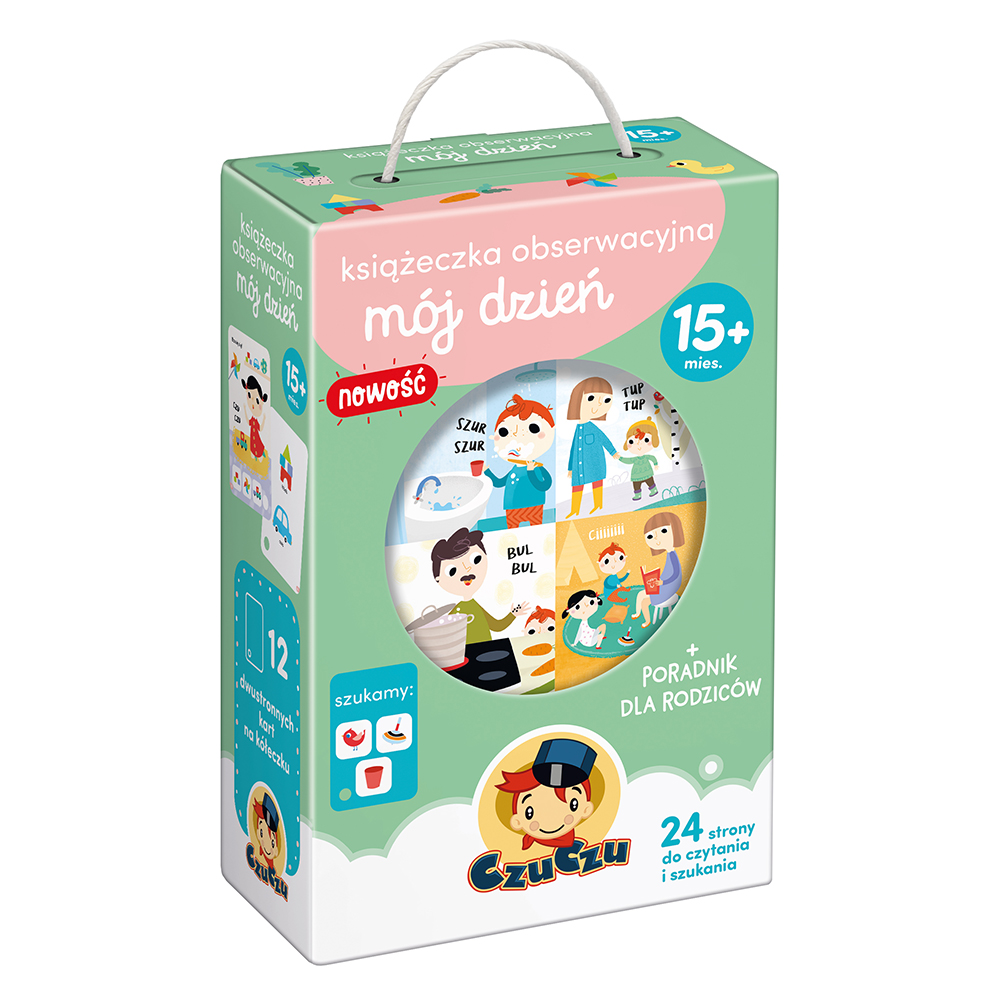 Innowacyjna kartonowa książeczka w pomysłowy sposób zachęci najmłodszych do zwracania uwagi na to, co widać i słychać wokół nich. Na 24 stronach pokazano przedmioty i sytuacje znane maluchom z codzienności. Dodatkowa zabawa polega na wyszukiwaniu elementów z ramki na ilustracji. Praktyczne kółeczko pozwala na korzystanie z pojedynczych kart i zawieszenie jej np. przy wózku. Do zestawu dołączono poradnik dla rodziców, pełen pomysłów na wspólną zabawę.