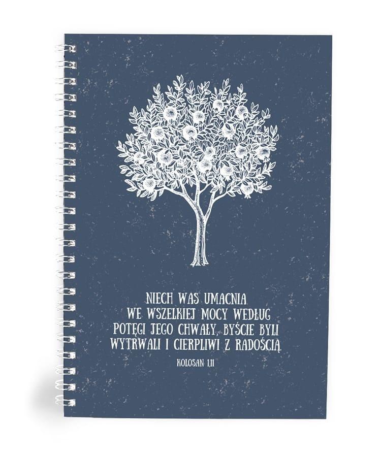 Minimalistyczna, urocza okładka z drzewem przypominającym o wzroście, stabilności i Bożej mocy. Cytat z Kolosan 1,11 to obietnica duchowej siły na każdy dzień.