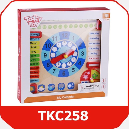 Drewniany kalendarz z ruchomymi elementami pomoże dziecku zrozumieć pojęcie czasu, mijających godzin, dni miesięcy. Kalendarz został zaprojektowany tak, aby zaangażować w dziecku myślenie i rozbudzić ciekawość. Na środku kalendarza namalowano zegar z obrotowymi wskazówkami. Tarczę zegara ponumerowano od 1 do 12. W środku zegara jest także tarcza minutnika. Tablica kalendarza ma namalowane 31 dni miesiąca, 7 dni tygodnia i 12 miesięcy. Nazwy namalowano w języku angielskim, dzięki czemu zabawa umożliwi dziecku naukę dodatkowego języka. Tablica ma różnorodne kształty z otworami służące do zaznaczenia kolejnego dnia tygodnia, miesiąca, aktualnej pogody i pory roku. Kalendarzem można bawić się w pozycji poziomej, a także dzięki przygotowanym specjalnie otworom można go powiesić na ścianie. Podczas zabawy dziecko ćwiczy zdolności manualne, rozwija umiejętności logicznego myślenia, koordynację ręka – oko, uczy rozpoznawania kolorów. Zabawki Tooky Toy są bezpieczne. Posiadają certyfikaty ekologicznych produktów. Pozbawione ostrych krawędzi, dobrze wygładzone, pomalowane są nietoksycznymi farbami i lakierami.