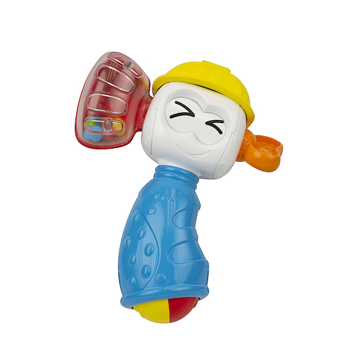 Młotek grzechotka ma ruchome elementy. Przekręcające się ucho, wydaje mechaniczne dźwięki i zmienia wyraz oczu. Umieszczona w dolnej części kuleczka, obraca się zmieniając kolory i tekstury. Przy potrząsaniu zabawką kolorowe kuleczki grzechoczą.
