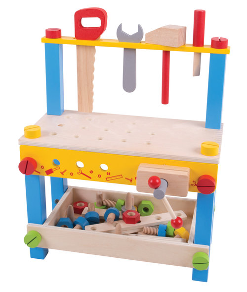 Solidnie wykonany warsztat drewniany zawiera 26 elementów do zabawy, w tym imadło, klucz, śrubki i nakrętki, śrubokręt i młotek. Młodzi konstruktorzy nauczą się podstaw majsterkowania. Wspaniały sposób na rozwinięcie zdolności koordynacji ręka/oko, zdolności motorycznych oraz kreatywnego myślenia. Wymaga złożenia przez osobę dorosłą.