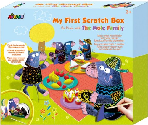 Jeśli idziesz na piknik, jaki rodzaj jedzenia i picia byś przygotował? Chcesz wiedzieć, co rodzina Kretów zabrała na piknik? Przyjdź i znajdź odpowiedź w Avenir Myfirst ScratchBox. Zdrap czarną powierzchnię na stronach zeszytu, aby odkryć, co przygotowała rodzina Kretów! Zabawa z jedzeniem gwarantowana!