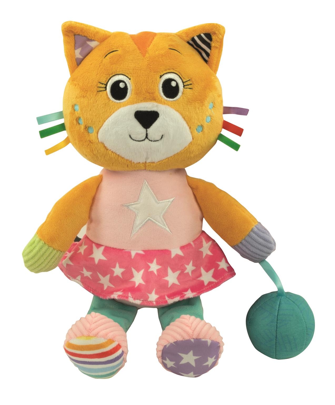 Słodki, miękki kociak. Miękki i bezpieczny przyjaciel, idealny do przytulania. Mała zawieszka w kształcie kulki z grzechotką do zabawy i pobudzania ciekawości dziecka. Różne rodzaje najwyższej jakości tkanin wspierających rozwój multisensoryczny. 100% można prac w pralce.