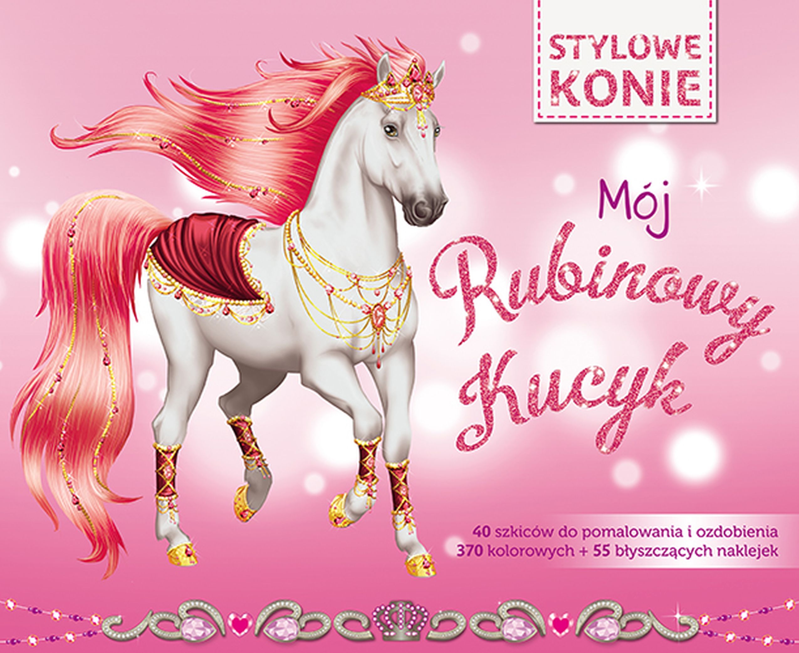 Ta śliczna książka zawiera aż 590 kolorowych naklejek (w tym 60 błyszczących!), a także 40 szkiców przedstawiających sylwetki przepięknych koników do pokolorowania i ozdobienia. Zapewnia wspaniałą, twórczą zabawę na długie godziny. Stwórz niepowtarzalnego kucyka, który rozbłyśnie jak najszlachetniejszy rubin! Odbiorcy – dzieci kochające konie; – dzieci lubiące twórcze zabawy z naklejkami. Dlaczego warto nabyć tę książkę – ćwiczy zręczność i spostrzegawczość; – pozwala rozwijać talent plastyczny; – zachęca do twórczej zabawy; – posiada wygodny, duży format.