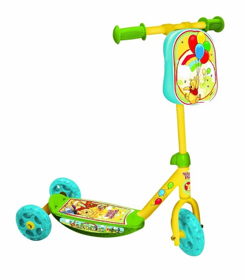 Hulajnoga trójkołowa Kubuś Puchatek z torebką na kierownicy. Maksymalne obciążenie do 20 kg. Dla dzieci od 1 roku życia.