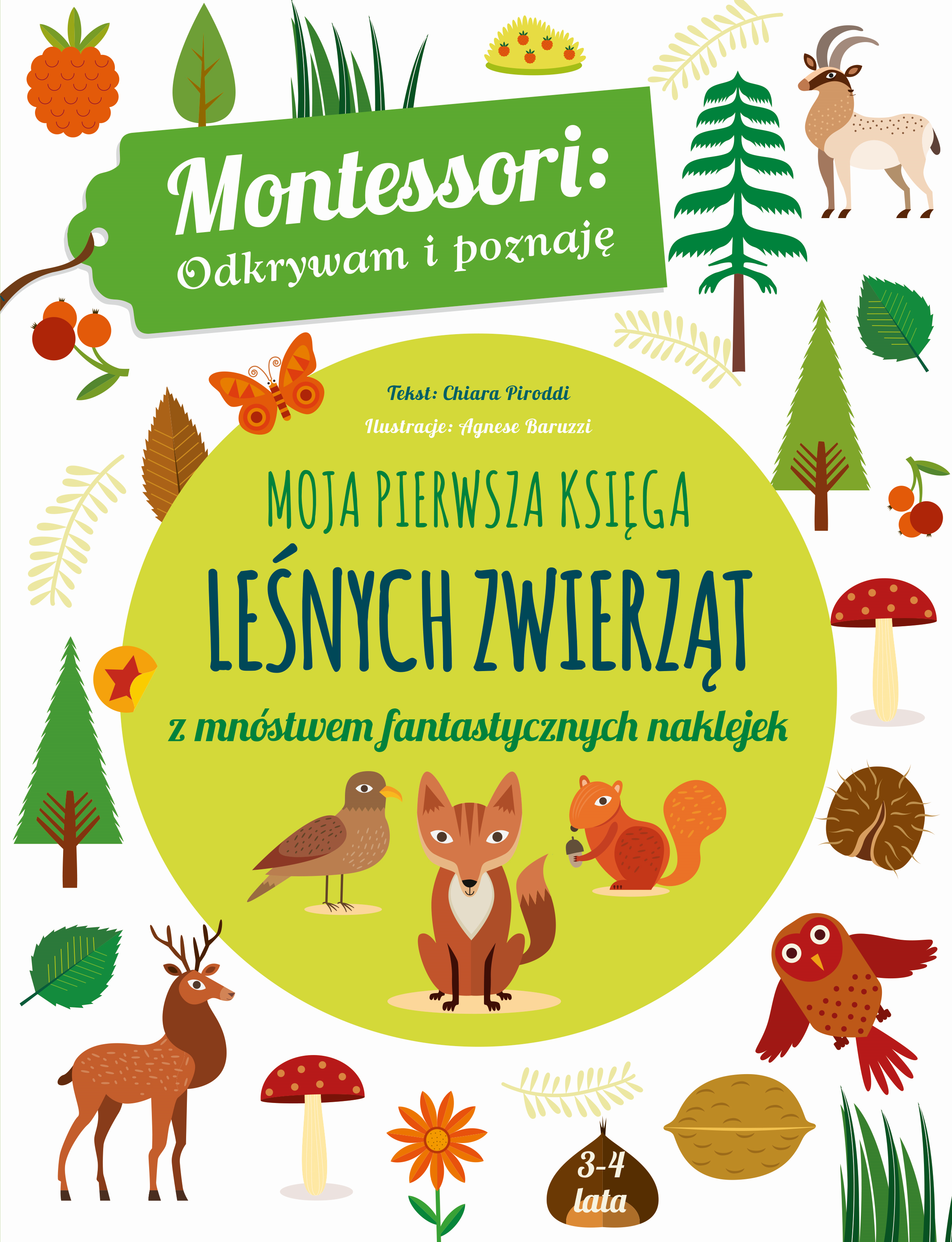 Trzy książeczki aktywizujące z naklejkami przygotowane przez specjalistę – psychologa, zilustrowane przez niezwykle utalentowaną włoską ilustratorkę – Agnese Baruzzi. Dzięki ćwiczeniom zgodnym z metodą Montessori dzieci zdobywają podstawową wiedzę dotyczącą środowiska na wsi, w lesie i ogrodzie. Uczą się rozpoznawać kolory, kształty, ćwiczą sprawność manualną, wzbogacają słownictwo. Metoda Montessori – system wychowawczy dzieci w wieku przedszkolnym i szkolnym stworzony przez włoską lekarkę Marię Montessori, który pomaga we wszechstronnym rozwoju dziecka. Zgodnie z tą metodą najważniejsze w wychowywaniu dziecka jest pozwolenie mu na rozwijanie się w swoim własnym tempie, samodzielność poprzez wspieranie, ale nie wyręczanie oraz nauka szacunku do innych. Dzięki tej metodzie dziecko ma szansę na swobodny rozwój, a jednocześnie ma bardzo duże wsparcie ze strony rodziców i opiekunów.