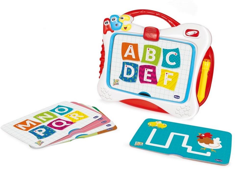 EDU PIERWSZA TABLICA to tablica LCD z zestawem papierowych kart, która pomaga w rozwijaniu umiejętności pisania - uczy pisania liter i liczb.