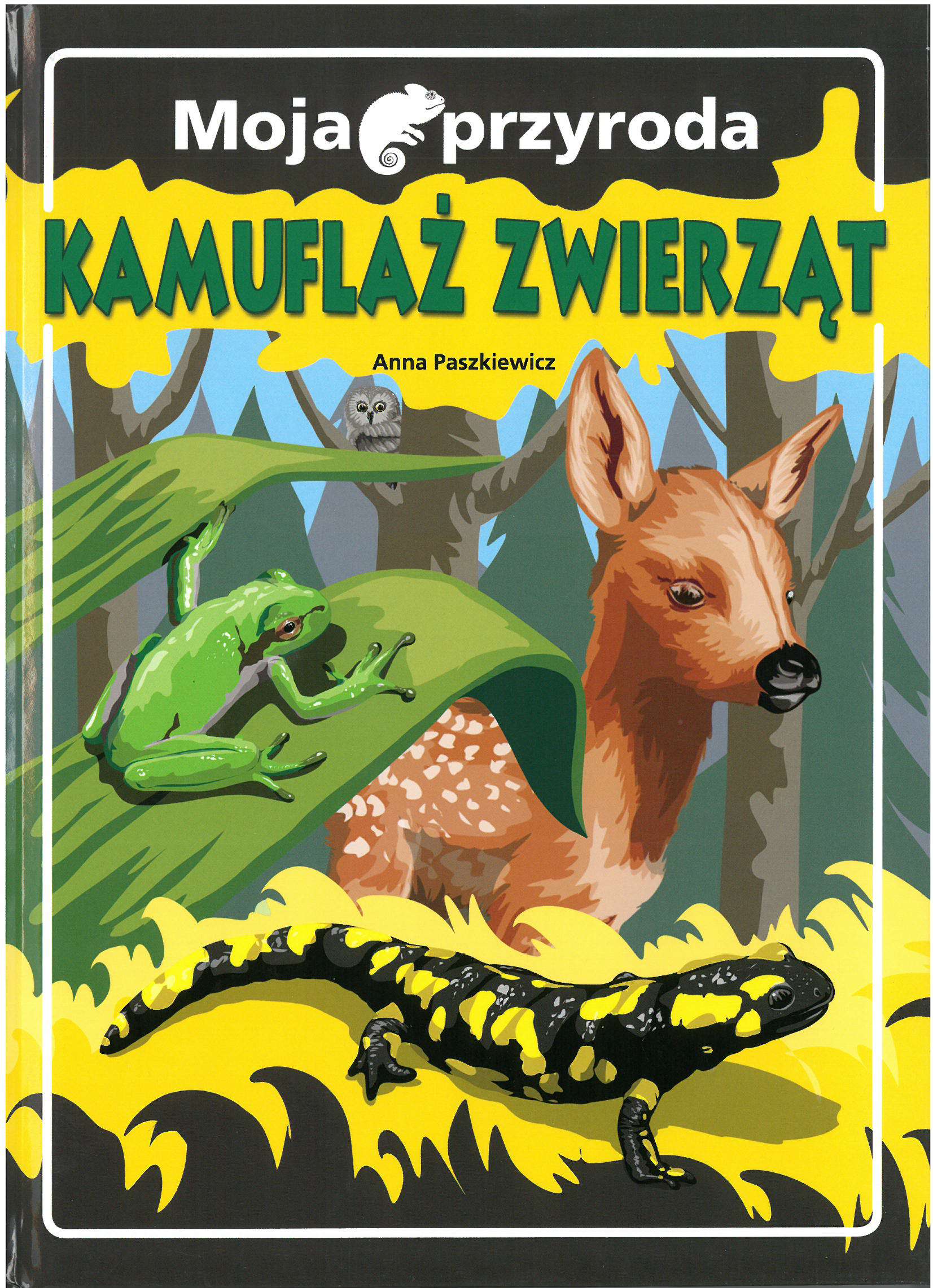 Moja przyroda. Kamuflaż zwierząt to książka, w której znajdziesz wierszyki oraz krótkie opisy zwierzaków potrafiących upodobnić się do otoczenia lub do innych gatunków. Dowiesz się, dlaczego niektóre zwierzęta muszą się ukrywać. Poznasz ich niezwykłe sposoby na to, by wyglądać jak gałązka, suchy listek, kępa trawy czy nawet… kwiat. Piękne ilustracje przybliżą ci fascynujący świat przyrody.
