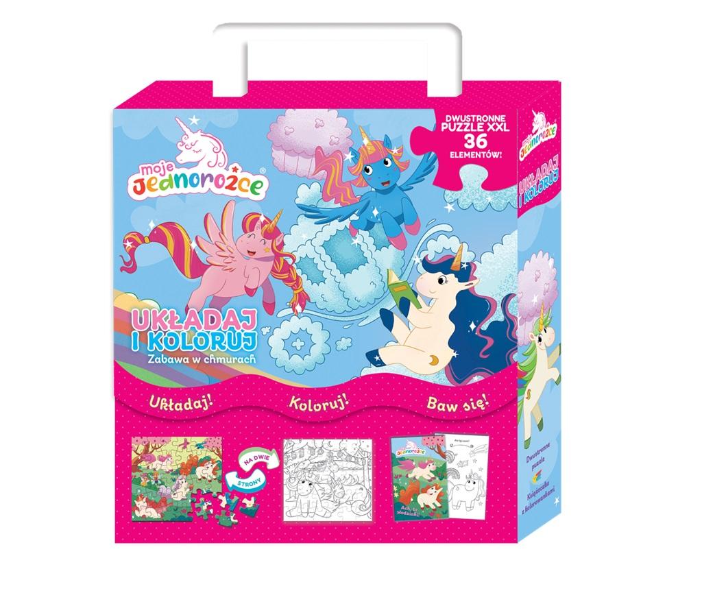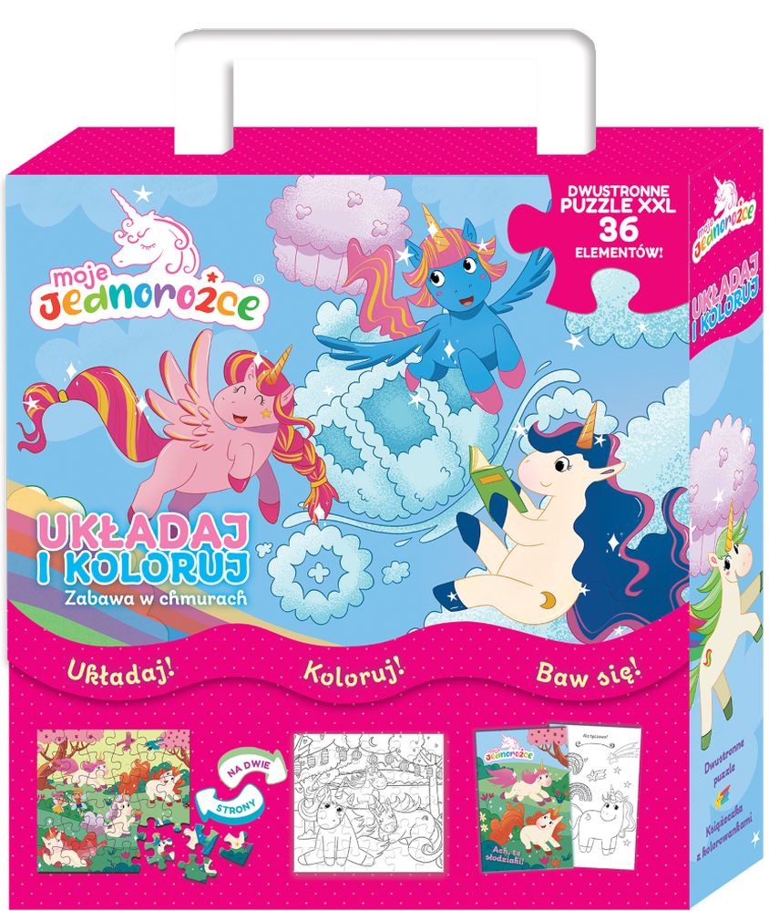 Oto pudełko pełne zabawy! Wewnątrz znajdziesz książeczkę z malowankami oraz dwustronne puzzle. Ułóż obrazek z bohaterami, a potem odwróć układankę i pokoloruj scenkę według własnego pomysłu.