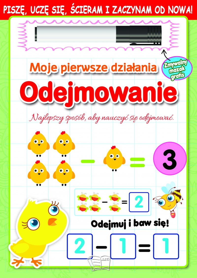 Pisanie literek, odkrywanie nowych słów i wykonywanie działań matematycznych może być świetną zabawą. Dzięki użyciu ścieralnego pisaka dziecko będzie ćwiczyło pisanie i doskonaliło swoje umiejętności. Czynności może powtarzać wielokrotnie, aż do osiągnięcia pełnej biegłości. Tytuły z tej serii: Uczę się pisać Duże litery Uczę się pisać Angielskie słówka Uczę się pisać Liczby od 1 do 40 Uczę się pisać Małe litery Moje pierwsze działania Mnożenie Moje pierwsze działania Dodawanie Moje pierwsze działania Odejmowanie Kosmiczna przygoda