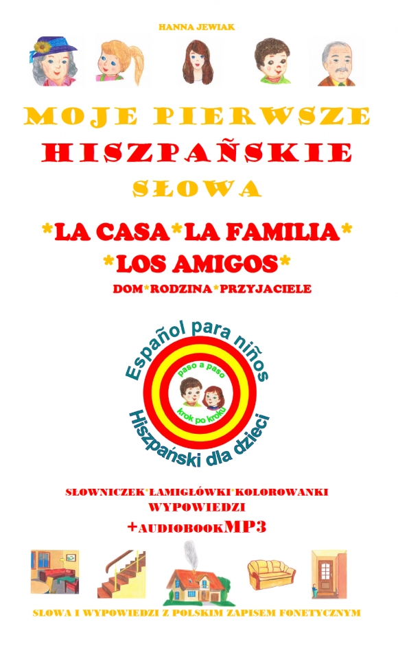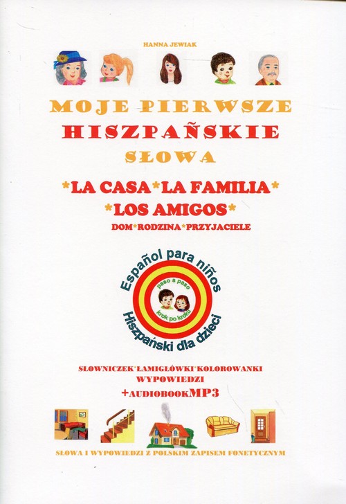 MOJE PIERWSZE HISZPAŃSKIE SŁOWA - DOM RODZINA PRZYJACIELE to książka należąca do serii ""Moje pierwsze hiszpańskie słowa"". Jest to tematyczny słownik obrazkowy dla dzieci, który pozwoli w łatwy sposób przyswoić nazwy członków rodziny i elementów domu. Dzięki licznym i ciekawym ćwiczeniom i wypowiedziom dziecko trwale zapamięta nazwy i pisownię poszczególnych pojęć zawartych w książce. Wszystkie słowa i wyrażenia posiadaja także polski zapis fonetyczny, który pozwoli szybciej przyswoić prawidłową wymowę. Ponadto każda książka posiada nagranie audiobook mp3 do pobrania ze strony wydawnictwa za pomocą kodu znajdującego się na tylnej okładce książki, które to nagranie pozwoli na osłuchanie się z prawidłową wymową treści zawartych w opracowaniu.