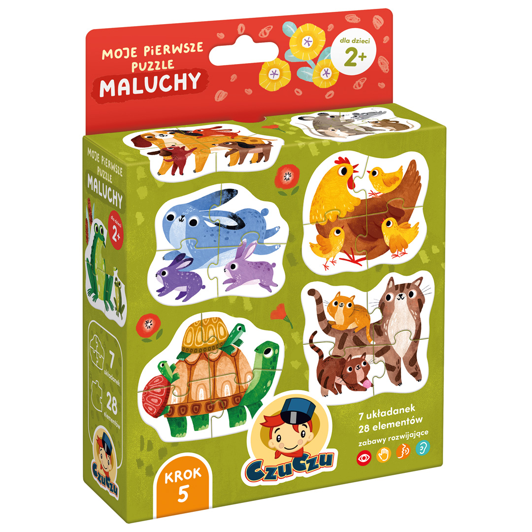 Hej, maluchy, czas na pierwsze kilkuelementowe puzzle! Sympatyczne zwierzaki i ich rodzice zapraszają do podjęcia puzzlowego wyzwania. Moje pierwsze puzzle Maluchy to edukacyjny zestaw, który zawiera 4 kolorowych układanek, a każda składa się z 4 dużych elementów.