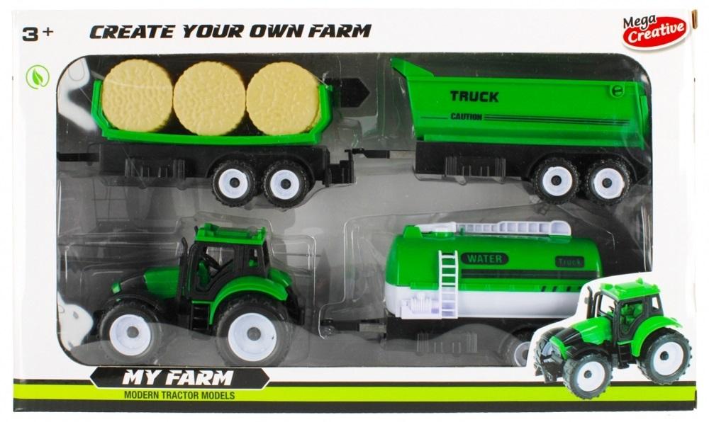 Zalety produktu: traktor posiada funkcję pull&back dzięki czemu po pchnięciu pojazdu do przodu kontynuuję jazdę samodzielnie, posiada trzy różne przyczepy z ruchomymi elementami. Traktor rolniczy z serii Moje Ranczo to nowoczesny model traktora posiadający szereg możliwości i efektywności pozwalających na różnorodną i rozwijającą zabawę. Traktor plus trzy przyczepy to wspaniała zabawa dla każdego chłopca, który chce poczuć się jak rolnik. Zawartość zestawu: traktor, 3 x przyczepy. Całość wykonana z plastiku. Wymiary/waga/baterie: wymiary produktu (dł. x wys. x gł.) [cm]: traktor-13x8x7, przyczepy- 18x9x7, wymiary opakowania ( dł. x wys. x gł.) [cm]: 38x22x7,5, waga produktu bez opakownia [kg]: 0,21 kg, waga produktu w opakowaniu [kg]: 0,44 kg, nie wymaga zasilania bateriami. Produkt przeznaczony dla dzieci w wieku 3+. Pakowany w kartonik z okienkiem.