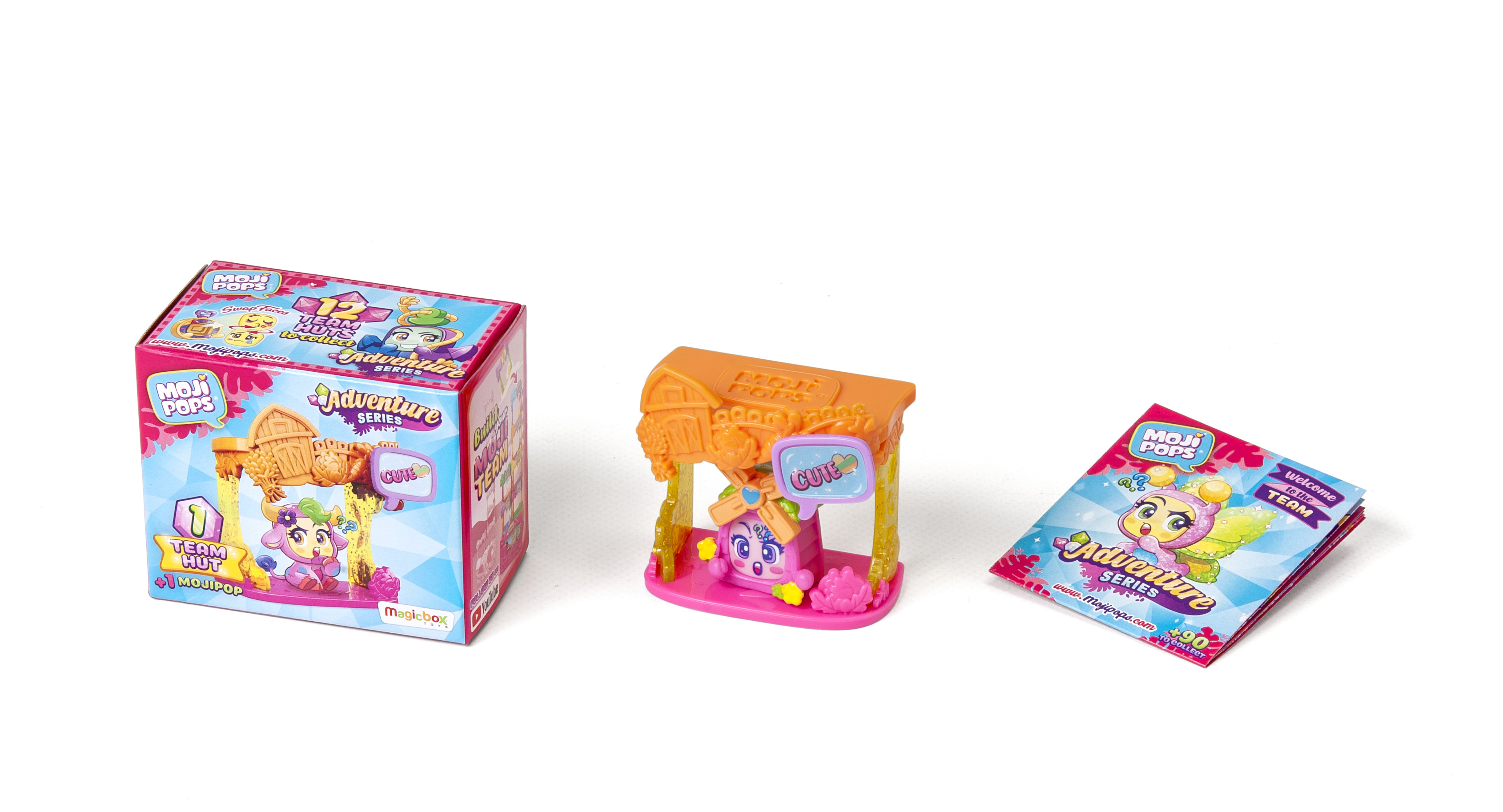 Pudełko zawiera 1 Team Hut i 1 figurkę MojiPop Adventure.