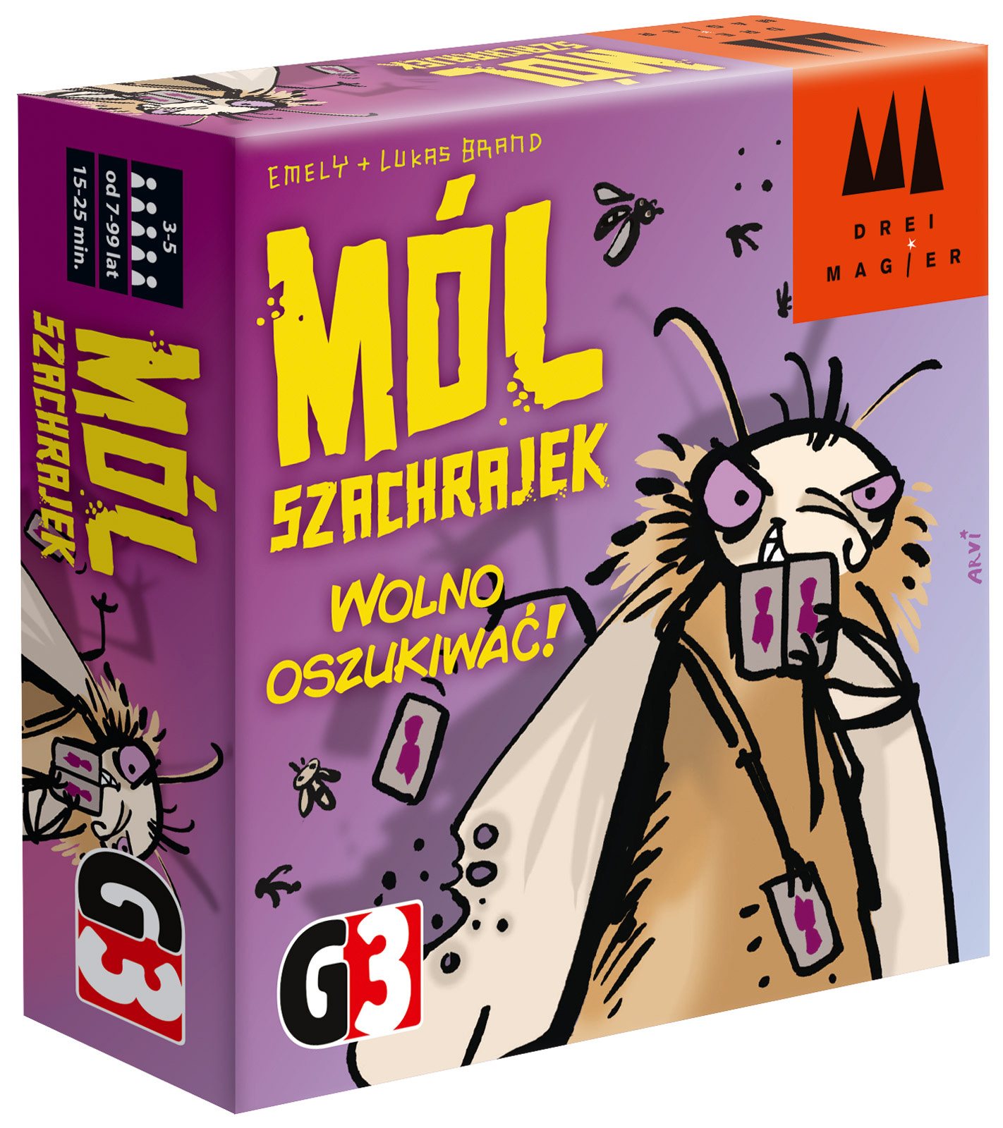 Rzucanie kart pod stół, wyrzucanie za siebie czy chowanie ich w rękawie w grach jest zwykle zabronione. Tym razem jest inaczej! Mól szachrajek to najbardziej niepożądana karta. Ten, kto wejdzie w jej posiadanie będzie się musiał nieźle natrudzić, żeby się jej pozbyć. Najbardziej kreatywne sposoby oszukiwania będą najskuteczniejsze. Zadaniem graczy jest jak najszybsze pozbycie się swoich kart, zręcznie przy tym oszukując. W swojej turze każdy musi wyłożyć jedną z kart trzymanych na ręce. Musi mieć ona wartość o jedną wyższą lub niższą niż karta leżąca już na stole. Jeśli gracz nie posiada pasującej karty, dobiera jedną kartę z wierzchu talii, a tura przechodzi na następną osobę. Gdy nikt nie widzi, uczestnicy mogą chować pojedyncze karty. PUDEŁKO ZAWIERA: 72 karty instrukcja Ilość graczy: 3-5 Wiek: 7-99 lat Czas: 15-25 minut