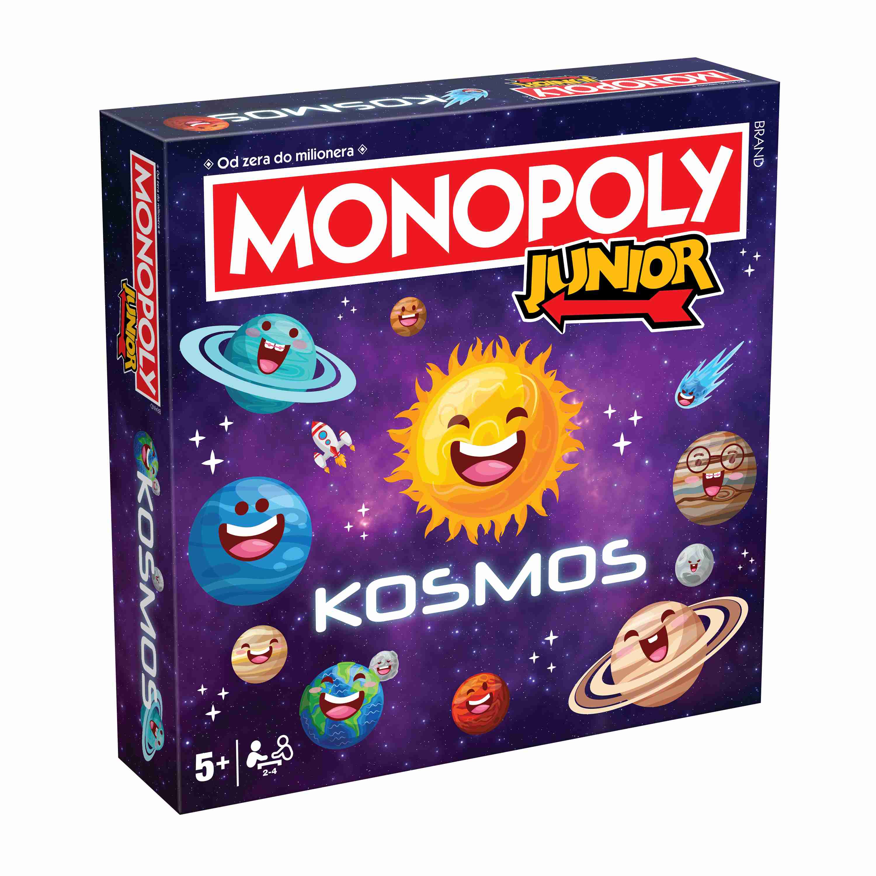 Witamy w Kosmosie! W tej wersji Monopoly Junior czeka na Ciebie niesamowita przygoda! Rakiety, planety i stacje kosmiczne już nie mogą się doczekać, aż je odwiedzisz. Wsiadaj na pokład swojej rakiety i leć badać odległe galaktyki oraz odkrywać tajemnice kosmosu. Pamiętaj, żeby zatankować swoją rakietę na stacji orbitalnej kosmiczne podróże wymagają dużo paliwa! Uważaj na burze kosmiczne, które mogą pokrzyżować Twoje plany. O nie! Twoja rakieta się zepsuła? Spokojnie, pomocni astronauci i ich dzielne roboty na pewno wszystko naprawią. Gotowy na kosmiczną zabawę?