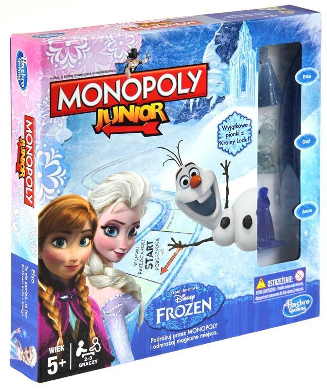 Monopoly Junior to klasyczna gra ekonomiczna dla najmłodszych! Specjalna wersja zachęca dzieciaki do liczenia i zabawy na stylowej planszy Monopoly, na której kupujemy miasta. Gra zawiera m.in. cztery klasyczne pionki Monopoly w wersji Junior. Czas na rodzinną grę! W grze spotyka się moc śniegu oraz lodu. Dołącz do Anny, Elsy i Olafa w ich podróży przez Arendelle i kupuj magiczne lokalizacje. Zbierz nroźną gotówkę i rozmroź swoje zamrożone serce. Zawartość: plansza 3 pionki 24 karty Szansy 36 znaczników postaci 90 banknotów kostka, instrukcja. Liczba graczy: 2-3 Wiek 5+