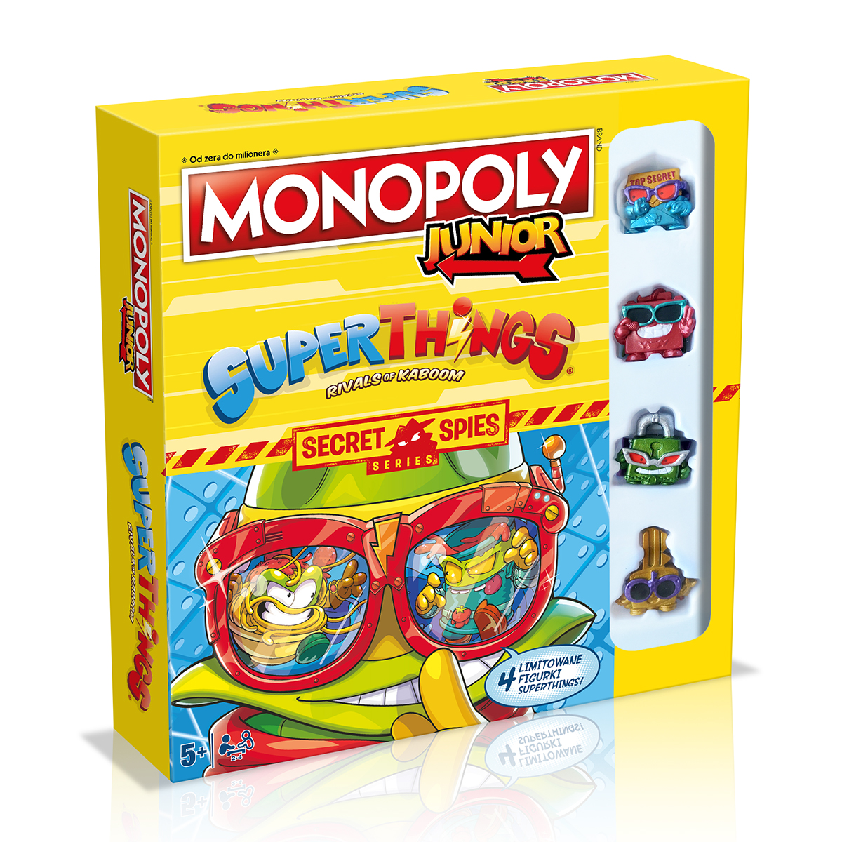 MONOPOLY JUNIOR: SUPER THINGS Nastała nowa era w Kaboom City: czas szpiegów! Podróżuj po planszy i przeprowadź dochodzenie, co tak naprawdę planują SuperThings? Zdecydujesz się pomóc Bohaterom, a może przejdziesz na stronę Złoczyńców? Wybierz jedną z czterech ekskluzywnych figurek SuperThings Secret Spies: X-385 II, Snitchcase, Locke Looker i Keytective. Każda z nich nosi Spy Glasses, dlatego umieść figurkę pod ciepłą wodą i dowiedz się, komu faktycznie pomagają? Nie zapominaj, że Oculus Max ma wszystko na oku! Poznaj prawdziwe zamiary Secret Spies w tej nowej, specjalnej edycji MONOPOLY Junior: SuperThings! Monopoly Junior to wspaniałe wprowadzenie najmłodszych graczy do świata Monopoly. W tej edycji gry dzieci mogą grać samodzielnie dzięki uproszczonym zasadom. Zasady gry Zasady gry są podobne do zasad obowiązujących w klasycznej wersji gry Monopoly. Po rozłożeniu planszy i wyborze jednego z 4 kolekcjonerskich pionków należy rozdać każdemu z graczy odpowiednią liczbę banknotów. Rozgrywkę rozpoczyna osoba, która wyrzuci najwięcej oczek na kostce. W trakcie każdej kolejki rzuć dwiema kostkami, a następnie rusz się o liczbę pól równą sumie wyrzuconych oczek. Zawartość plansza 4 limitowane figurki SuperZings 24 karty „Szansy” 36 papierowych znaczników 70 banknotów Monopoly kostka instrukcja Specyfikacja Liczba graczy: 2-4 Wiek: 4+ Czas gry: 1-3 h Język wydania: polski