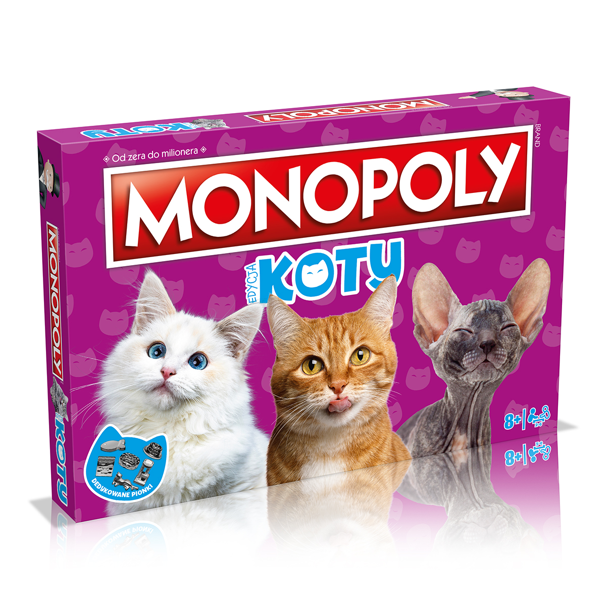 Miękkie, przytulaśne i ciekawskie koty są wspaniałymi towarzyszami człowieka. W sekundę potrafią podbić nasze serca (i domy) oraz stać się ukochanymi członkami rodziny. Wraz z nową edycją gry MONOPOLY przenosimy cię do świata cudownych, mruczących przyjaciół. Podczas gry odwiedzisz ulubione miejsca do kociej drzemki i zabawy. Kupuj kocie domki i hotele, sięgaj po karty "Domowego Leniuszka" oraz "Poszukiwacza Przygód" oraz spróbuj zostać najlepszym kocim opiekunem.
