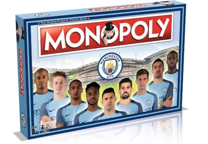 Edycja klasycznej gry Monopoly dla fanów klubu piłkarskiego Manchester City Zawartość: plansza 6 pionków 28 kart aktów własności 32 karty szansy 2 kostki banknoty instrukcja Wiek graczy: 8+ Liczba graczy: 2-6