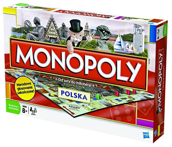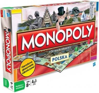 POLSKA edycja Monopoly już w sprzedaży! Na miasta, które znalazły się na planszy internauci oddali ponad 2 miliony głosów! I Ty graj o najpopularniejsze miasta w Polsce - Białystok, Kraków, a może Toruń? Co uczyni Cię bogatym? Jak wiele hoteli zdołasz postawić we Wrocławiu? A może wykupisz plażę w Gdyni? Uruchom wyobraźnię i zbijaj majątek na polskich miastach! Przygotuj się na ogólnopolską zabawę! Zawartość pudełka: plansza, 6 pionków, 28 kart Tytuł Własności, 16 kart Szansa, 16 kart Kasa Społeczna, 1 plik banknotów Monopoly, 32 zielone domki, 12 czerwone hotele, 2 kostki, instrukcja. Gra dla 2-6 graczy. Wiek: 8+