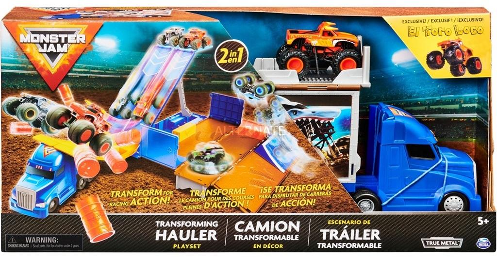 Z pojazdem transportowym 2w1 epicka akcja Monster Jam nigdy się nie kończy! Ten ekstra zestaw Monster Jam w skali 1:64 wygląda dokładnie jak pojazd transportowy, który przywozi samochody Monster Jam na każde show! W dołączonym do zestawu pojazdem El Toro Loco die-cast Monster Jam w skali 1:64 możesz kręcić pojazdem za pomocą specjalnego spinnera, a także ćwiczyć akrobacje i skoki na rampach i akcesoriach, które również znajdziesz w zestawie. Po treningu czas na wielki wyścig! Ustaw beczki na pojeździe transportowym, a El Toro Loco wraz z drugim pojazdem Monster Jam umieść na rampach. Wystrzel swoje samochody i patrz jak pędzą po rampach, rozbijając beczki! Ustaw beczki na nowo i rozpocznij wyścig jeszcze raz - dzięki wyjątkowemu zestawowi akcja nigdy się nie kończy! Po zakończeniu zabawy z łatwością złożysz zestaw chowając wszystkie elementy wewnątrz. Możesz tez przechowywać swoje samochody Monster Jam wewnątrz pojazdu transportowego, a dodatkowe cztery na jego dachu!