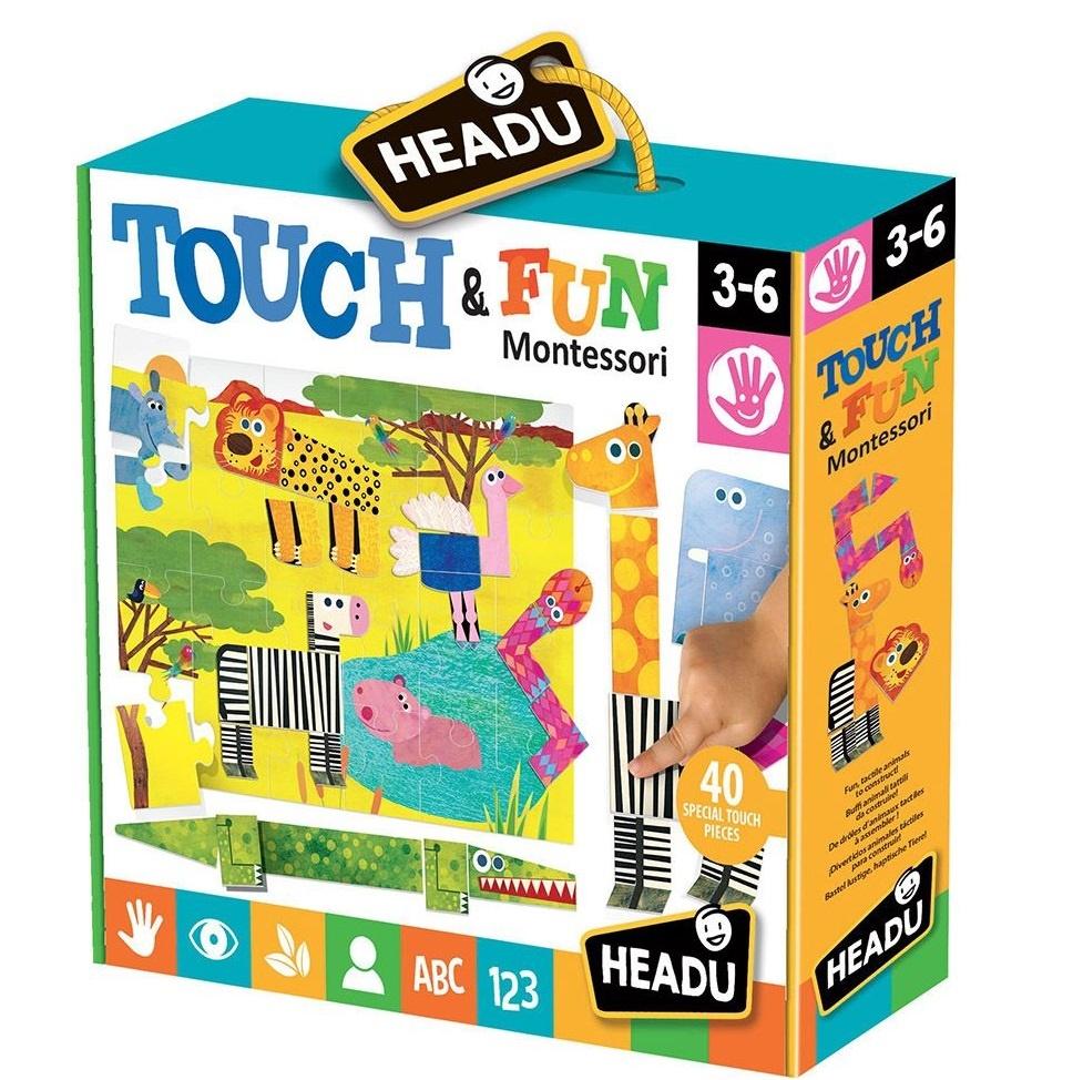 Touch & Fun Montessori - pod tą nazwą kryje się zestaw wyjątkowych puzzli. Dzięki specjalnym dotykowym modułowym kształtom zwierzęta z sawanny można łączyć na różne sposoby, a następnie umieszczać w dużej ilustrowanej układance. Ponadto można wymyślić dziwne nowe zwierzęta: kto ma chęć zbudować zebrodyla albo żyrafolwęża? Headu opiera swoją działalność o ideę pedagogiki Montessori, w której dziecko doświadcza na bardzo wielu poziomach i czerpie z otoczenia wszystkimi zmysłami. Każda zabawka jest zatem dodatkowo pomocą naukową! Wiek: 3-6 Pudełko: 28,5 x 25,5 x 6,1 cm