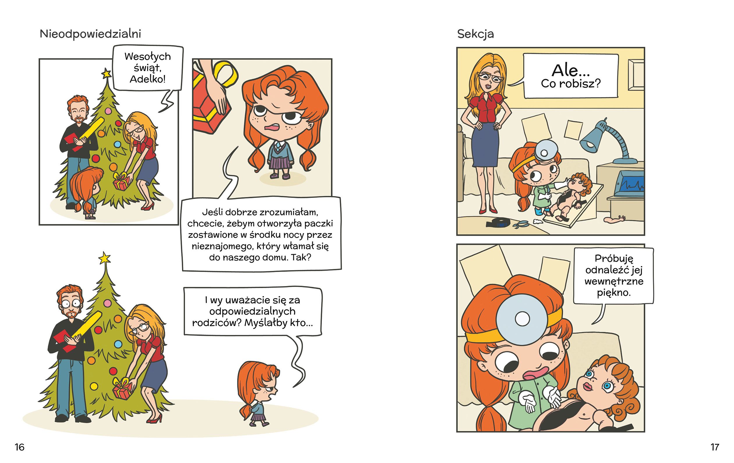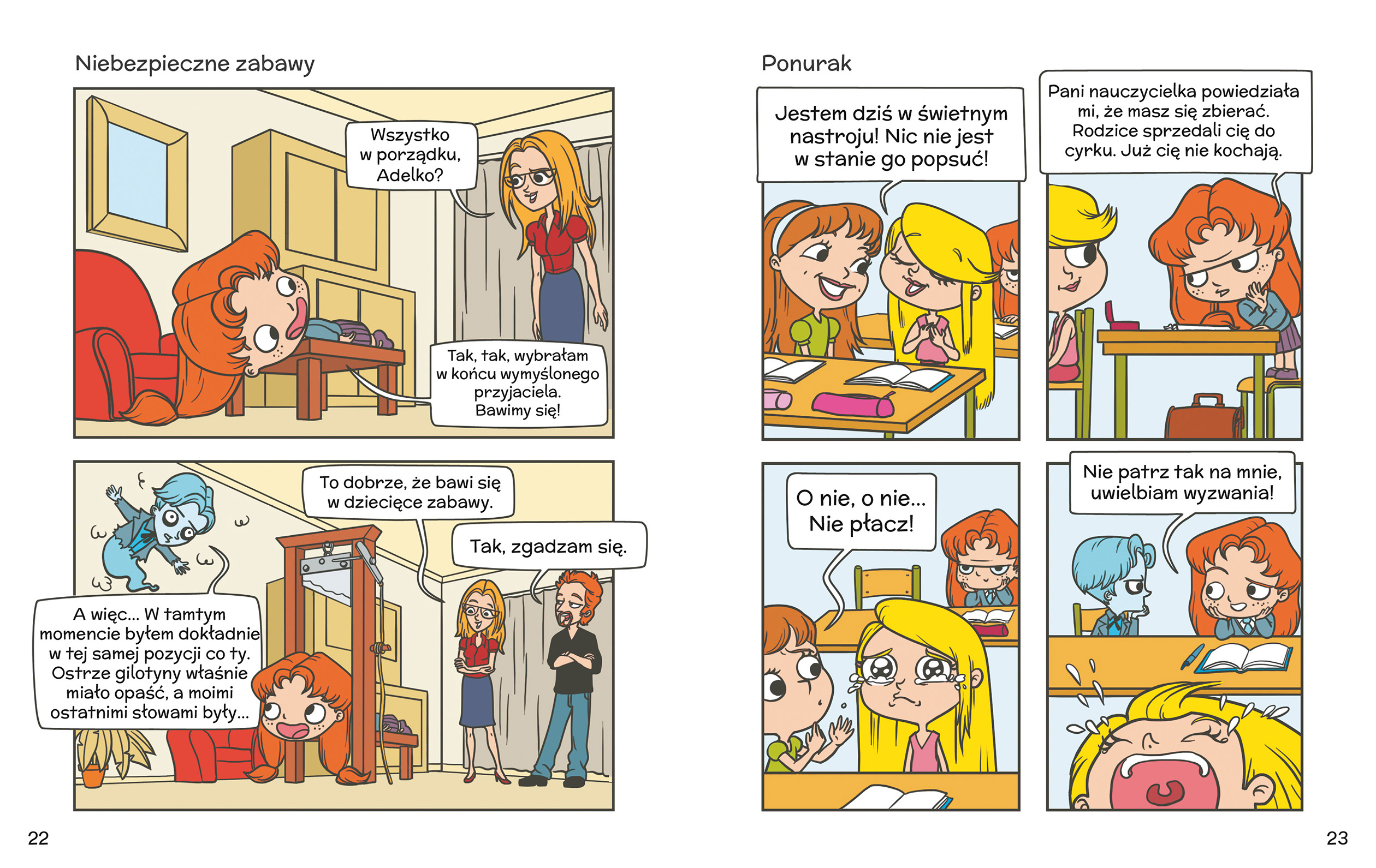 Spora dawka czarnego humoru i szczypta czułości – oto przepis Adelki na to, jak przeżyć w świecie, w którym nikt nie traktuje dzieci poważnie! Adelka byłaby zwykłą, uroczą dziewczynką z rudymi włosami i wielką głową, gdyby nie fakt, że szkoli się w byciu dyktatorem i świetnie udaje jej się wprowadzać terror w domu i w szkole. Bezskutecznie, ale nie poddając się, próbuje pozbyć się kota, który okazał się nie być lwem (co za rozczarowanie!). Nie interesują jej amory… no chyba że dzięki nim zyska kogoś na kształt niewolnika. Kusząca perspektywa… Jeśli wydawało wam się, że to dorośli rządzą światem – byliście w błędzie! Witajcie w świecie Adelki – dziewczynki, której nie da się polubić, ale też nie można jej nie pokochać! Fenomen we Francji – ponad 2 miliony sprzedanych egzemplarzy! Powyższy opis pochodzi od wydawcy.