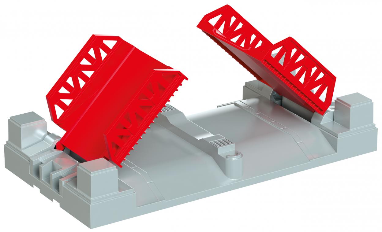 Powiększ swój zestaw kolejek Dumica o nowe akcesorium- podnoszony most! Dzięki specjalnej konstrukcji elementu, czerwony most opuści się, gdy tylko wjedzie na niego pociąg i podniesie, gdy ten bezpiecznie zjedzie na tor. Element jest jednoczęściowy.