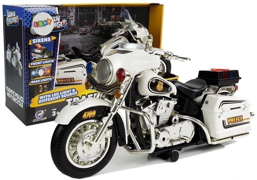 Motocykl Policja Biało- Czarny z Dźwiękami i Światłami Alternatywny wybór samochodów policyjnych, mamy do zaproponowania jednoślad dla służb specjalnych. Już teraz rozwiń w dziecku pasję i połącz fascynacje zawodem policji. Dopracowane w najmniejszym calu wnętrze i wygląd zewnętrzny oraz elementy imitujące realne części sprawią, że Twoja pociecha poczuje się jak na prawdziwym motorze. Można wyjechać w każdy teren, aby złapać przestępcę Motocykl posiada cztery przyciski uruchamiające efekty świetlne i dźwiękowe. Po naciśnięciu jednego z przycisków pojazd wydaje dźwięki syreny policyjne, klakson oraz odpalania a towarzyszą mu światła, które są zamontowane na przodzie i z tyłu jednośladowca. Kolorystyka biała z naklejkami policji oraz elementy części motoru dodadzą realizmu zabawce. Wymiary motocyklu: 33 cm x 10 cm x 20n cm Wymiary pudełka: 37 cm x 12,5 cm x 21 cm Motor zasilany jest trzema bateriami "AG13 (brak w zestawie). Zabawka przeznaczona jest dla dzieci powyżej 3. roku życia. Zestaw posiada certyfikat CE i jest zgodna z normą EN 71. Zapakowany jest w kartonik z przezroczystą witrynką, dzięki czemu idealnie nadaje się na prezent.