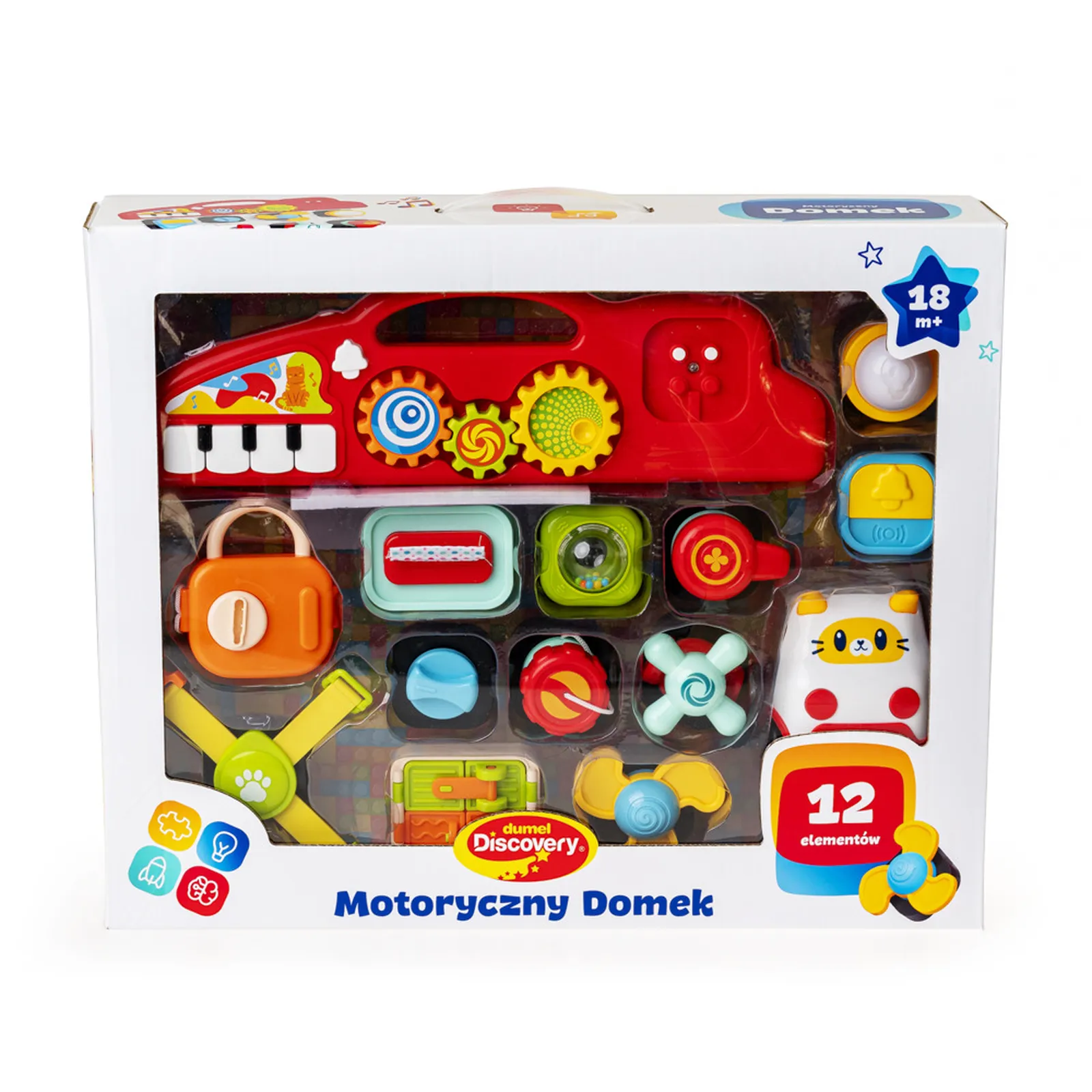 Domek stworzony z myślą o miłośnikach klocków i zręcznościowych niespodzianek! W zestawie znajdziemy dużą płytkę z wypustkami ściankę domku, do której można przypiąć klocki z motorycznymi zadaniami. Na małe paluszki czeka wiatraczek do obracania, zasuwki do przesuwania, klamerka do zapinania, element do przekręcania i wiele więcej! Dach domku wyposażony został nie tylko w praktyczny uchwyt do przenoszenia zabawki, ale także w dźwiękowy panel z mini pianinkiem i miejscem na przypięcie jednego z dwóch aktywnych klocków z dzwoneczkiem lub lampką. Dodatkowo znajdziemy tu też trybiki do przekręcania. To jeszcze nie wszystko! Poza domkiem i klockami, w skład zestawu wchodzi też pojazd z miejscami do przypięcia ulubionych, zręcznościowych klocków, żeby mogły one towarzyszyć maluchowi podczas podróży, dbając o sprawność jego paluszków.