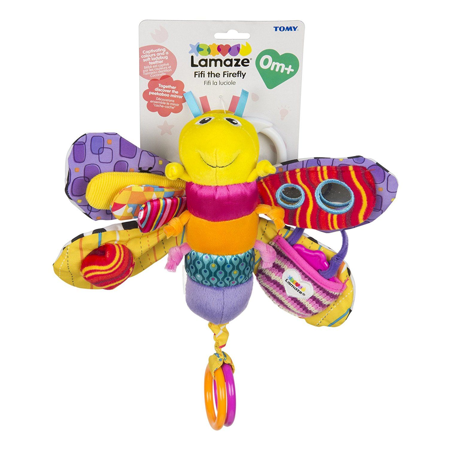 Motylek Fifi - zawieszka/grzechotka w żywych kolorach.Zabawka wykonana z materiałów o różnej fakturze.Posiada lusterko oraz gryzak. W skrzydełku znajduje się piszczałka oraz szeleszczący materiał.