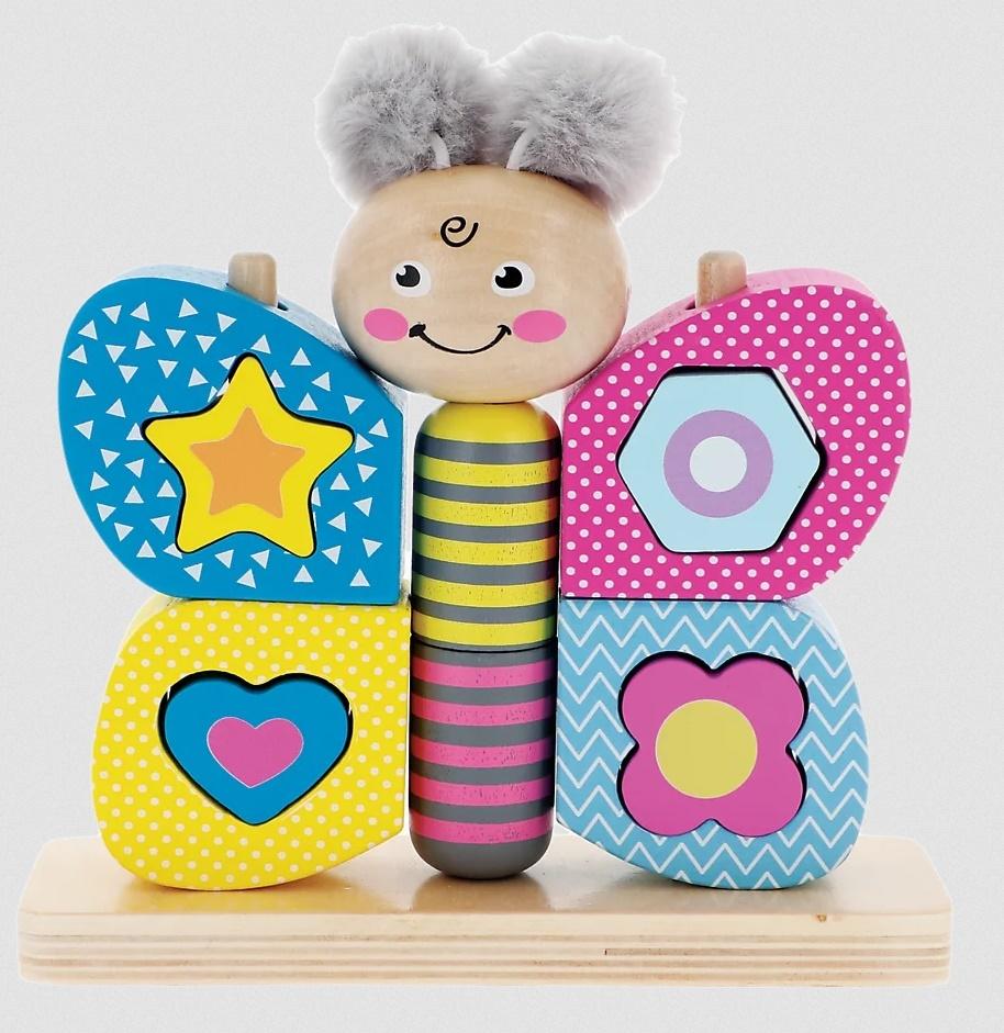 Motylek Pupilek z puszystymi pompopnami to drewniana zabawka wykonana z wysokiej jakości naturalnego drewna oraz pluszu. Skrzydełka po rozłożeniu pełnią funkcję sortera. Dodatkowo motylek składa się z 11 ruchomych klocków, które wspomagają rozwój zręczności i motoryki dziecka, a pluszowe pompony rozwijają zmysł dotyku.