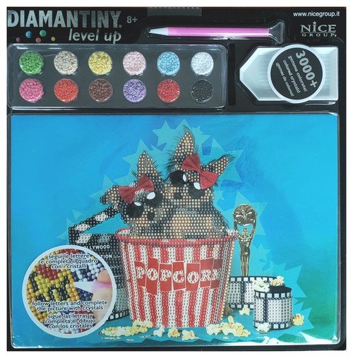 Zestaw z kryształkami do tworzenia mozaiek z kolorowymi kamieniami. Zabawa z mozaiką diamentową polega na układaniu obrazka z tysięcy malutkich, kolorowych diamencików według naniesionego na kartonie nadruku.Obrazek pokryty jest warstwą klejącą, która utrzymuje kryształki na odpowiednich miejscach. Kompletny zestaw do wykonania mozaiki zawiera: obrazek nadrukowany na grubej tekturze, na którym naniesione są literki i cyferki wskazujące miejsca, gdzie należy ułożyć poszczególne kolory; diamenciki w różnych kolorach; aplikator z woskiem, pojemnik na diamenciki oraz przewodnik po kolorach.