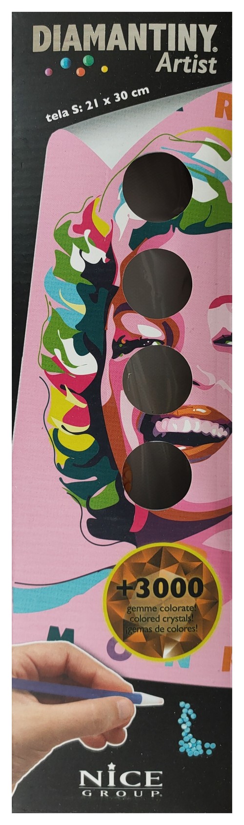 Zestaw z kryształkami do tworzenia mozaiek z kolorowymi kamieniami. Zabawa z mozaiką diamentową polega na układaniu obrazka z tysięcy malutkich, kolorowych diamencików według naniesionego na kartonie nadruku. Obrazek pokryty jest warstwą klejącą, która utrzymuje kryształki na odpowiednich miejscach. Kompletny zestaw do wykonania mozaiki zawiera: obrazek na drukowany na grubym płótnie, na którym naniesione są literki i cyferki wskazujące miejsca, gdzie należy ułożyć poszczególne kolory; diamenciki w różnych kolorach; aplikator z woskiem, pojemnik na diamenciki oraz przewodnik po kolorach.