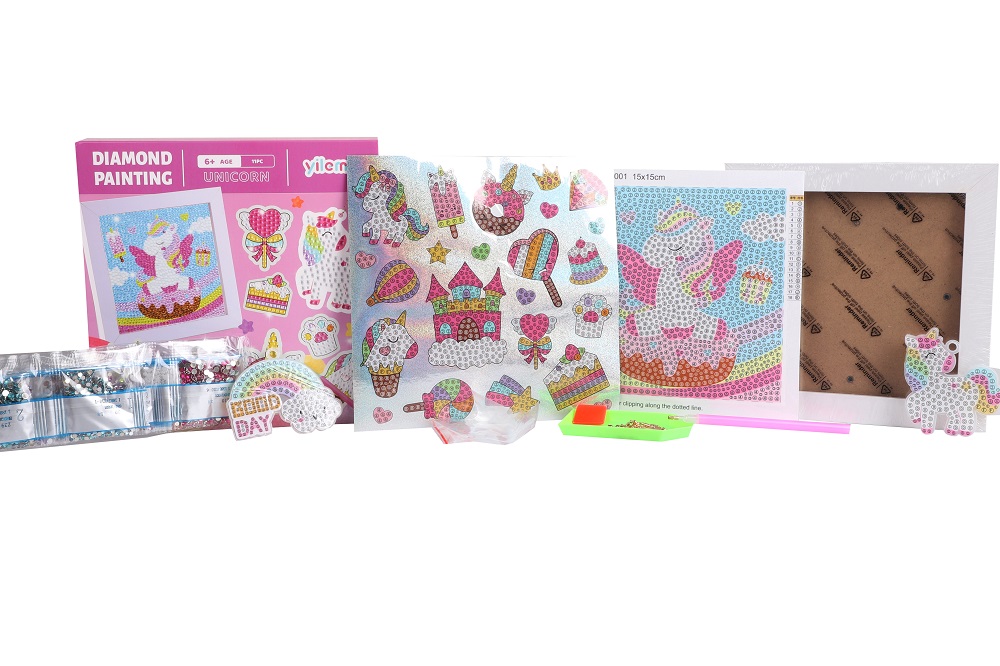 Wyklejony obrazek jednorożca będzie idealną ozdobą pokoju, a diamentowe breloczki przyczepisz do swojej ulubionej torebki czy plecaka. Zawartość: