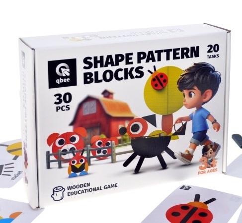 Kolorowa mozaika drewniana w kształcie od TM qbee składa się z 30 elementów, z których można ułożyć stylizowane wizerunki zwierząt, roślin, przedmiotów gospodarstwa domowego, cyfr i liter, kształtów geometrycznych, ozdób.