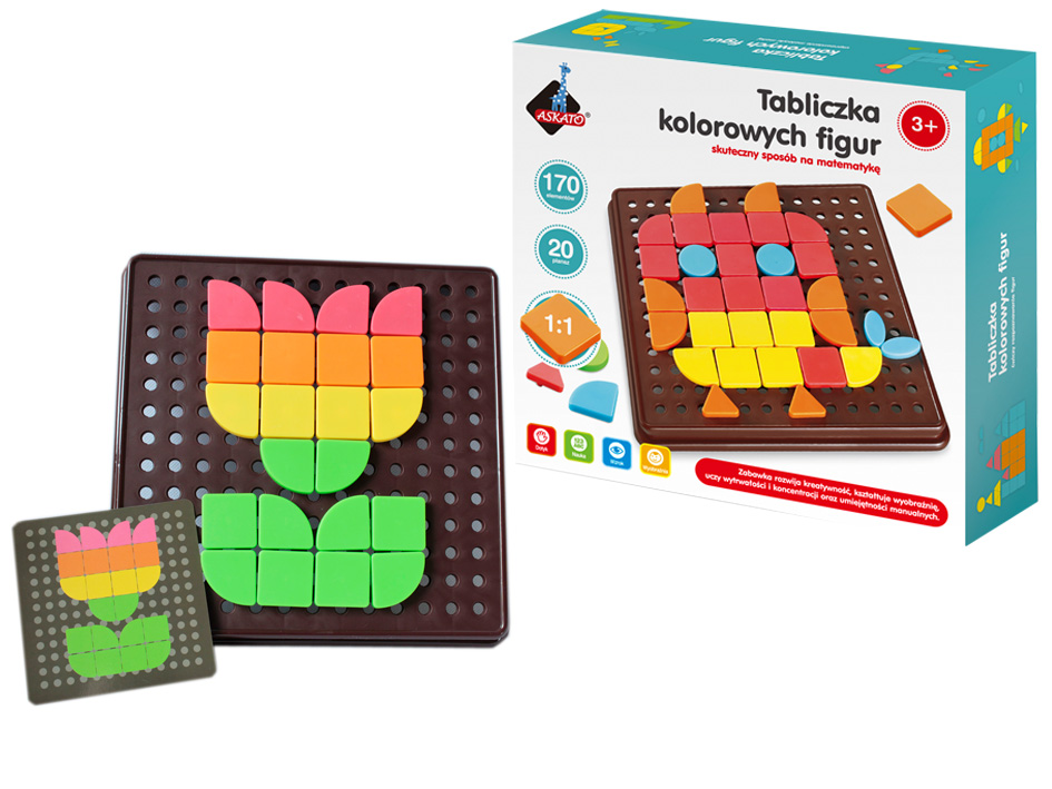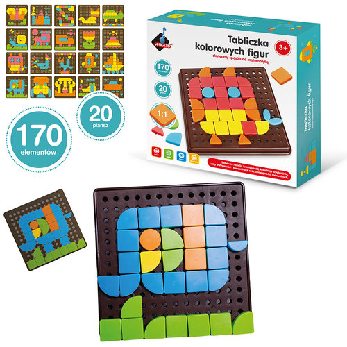 Żywe kolory oraz różnorodność obrazków do odwzorowania zachęca dziecko do zabawy i uczy nazywania i rozpoznawania kształtów i kolorów. Zestaw zawiera 170 części. Znajdują się w nim podstawowe figury w 5 podstawowych kolorach. Zabawka zawiera  20 przykładowych schematów, dzięki którym dziecko rozpoznaje informacje, segreguje je uczy się wyodrębniać to co istotne i łączy wszystko w całość tworząc kompletny szablon.