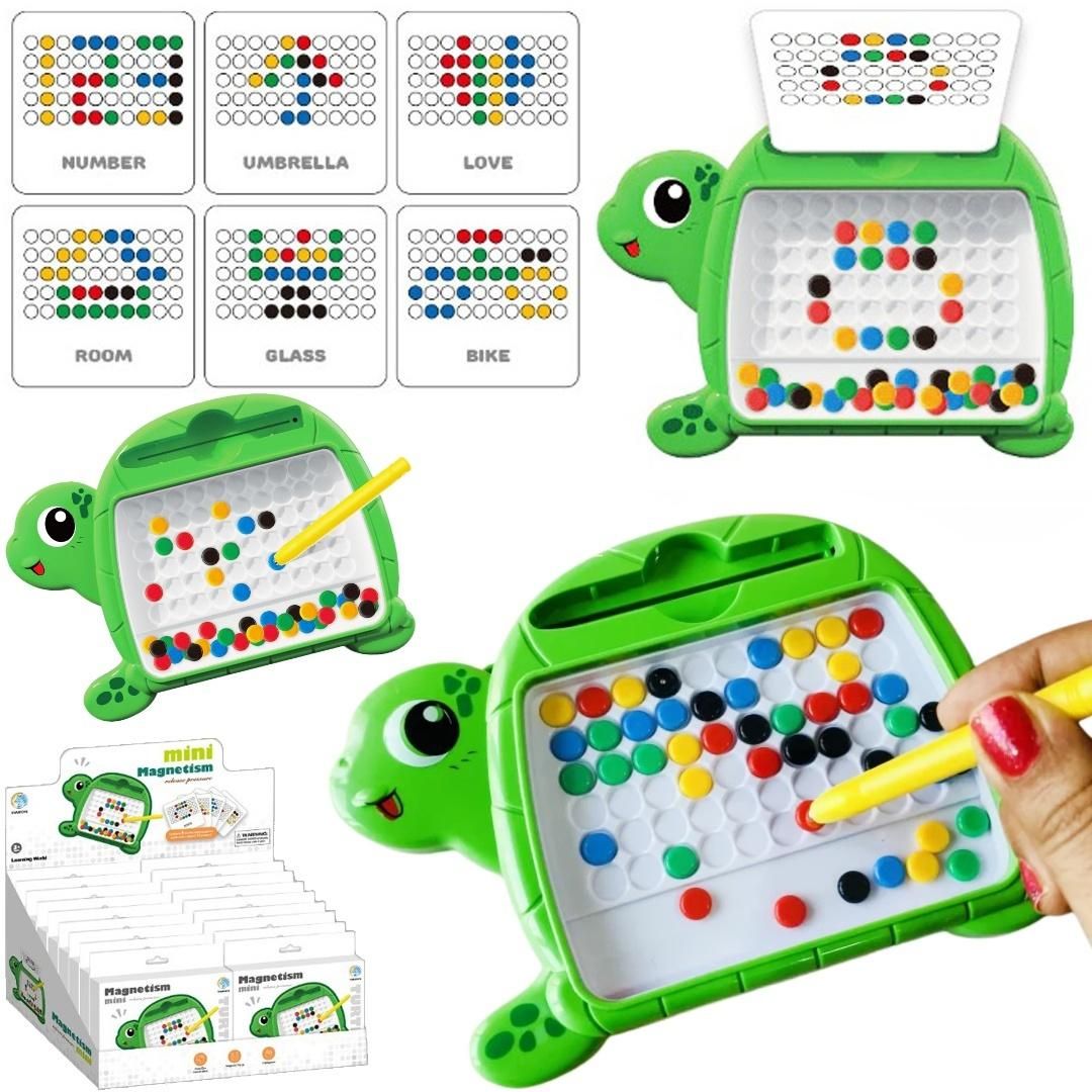 Przedstawiamy uroczą, edukacyjną zabawkę dla najmłodszych - magnetyczną tablicę w kształcie żółwia! To idealny sposób na rozwijanie kreatywności i zdolności manualnych u dzieci, łącząc zabawę z nauką. Główne cechy produktu: Magnetyczna konstrukcja: Zabawka działa na zasadzie magnesów - pod szklaną osłoną znajdują się kolorowe kuleczki, które można przesuwać za pomocą dołączonego rysika z magnetyczną końcówką. Kreatywna zabawa: Dziecko może tworzyć własne, kolorowe wzory i obrazki, co stymuluje wyobraźnię i zdolności artystyczne. Edukacja: W zestawie znajdują się karty z przykładowymi wzorami (np. cyfry, parasol, rower), które pomagają w nauce rozpoznawania kształtów i kolorów. To doskonałe wprowadzenie do świata liczenia i rysowania. Bezpieczeństwo: Zabawka jest w pełni bezpieczna dla dzieci - kuleczki są szczelnie zamknięte wewnątrz obudowy, więc nie ma ryzyka ich połknięcia. Wygodna forma: Kompaktowy rozmiar i lekka konstrukcja sprawiają, że zabawka jest idealna do zabawy w domu, w podróży czy w samochodzie. Trwałość: Wysokiej jakości materiały gwarantują długotrwałą zabawę. Uroczy design: Kształt uśmiechniętego żółwika w zielonym kolorze z pewnością przyciągnie uwagę każdego malucha. Wielkość opakowania: 16x13x2 cm Korzyści dla rozwoju dziecka: Rozwój motoryki małej: Przesuwanie kuleczek za pomocą rysika wzmacnia chwyt i precyzję ruchów rączek. Rozwój koordynacji wzrokowo-ruchowej: Dziecko musi precyzyjnie celować rysikiem, aby przesunąć kuleczkę w wybrane miejsce. Nauka kolorów i kształtów: Tworzenie wzorów z kolorowych kulek pomaga w nauce i utrwalaniu wiedzy. Stymulowanie koncentracji: Zabawa wymaga skupienia i cierpliwości, co pozytywnie wpływa na zdolność koncentracji. Ta magnetyczna tablica to fantastyczny, edukacyjny prezent, który zapewni dziecku wiele godzin kreatywnej i wartościowej zabawy!