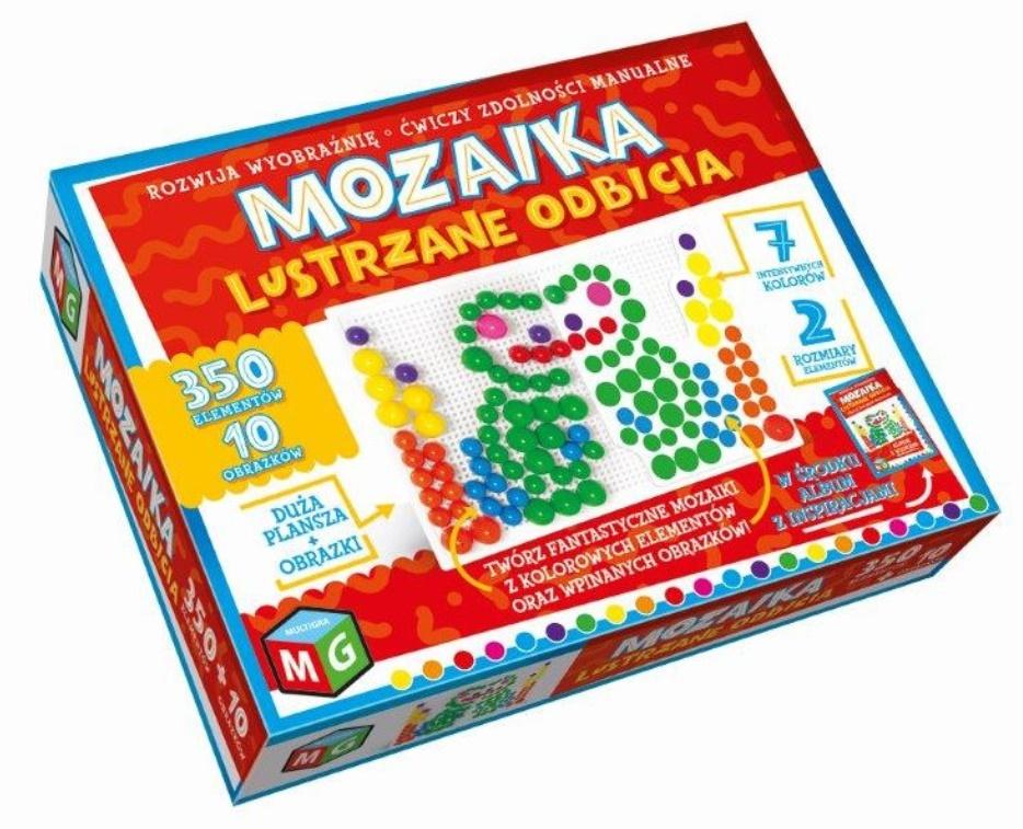 Mozaika ""LUSTRZANE ODBICIA"" to kreatywny zestaw edukacyjny zarówno dla małych, jak i dużych. W skład zestawu wchodzi duża plansza o wymiarach 19,8 cm x 28,3 cm do układania wzorów oraz 350 elementów w dwóch rozmiarach oraz 10 obrazków. Wystarczy wpiąć w ażurową tablicę obrazek, dobrać odpowiednie kolory oraz wielkość elementów i ułożyć lustrzane odbicie wzoru z obrazka. Zabawka pobudza kreatywność i rozwija wyobraźnię. Usprawnia małą motorykę u dzieci i pomaga odkryć na nowo dziecięcą przyjemność z zabawy u trochę starszych. Do zestawu dołączony jest album z wzorami. Możecie również pobudzić swoją wyobraźnię i układać własne motywy. Po wykonaniu projektu wystarczy wyjąć elementy i zacząć od nowa. Zawartość pudełka: plansza o wymiarach: 19,8 cm x 28,3 cm - 1szt, średnie elementy 23mm - 266 szt, duże elementy 30mm - 84szt, ilustracje do wpinania - 10 szt, album z inspiracjami.