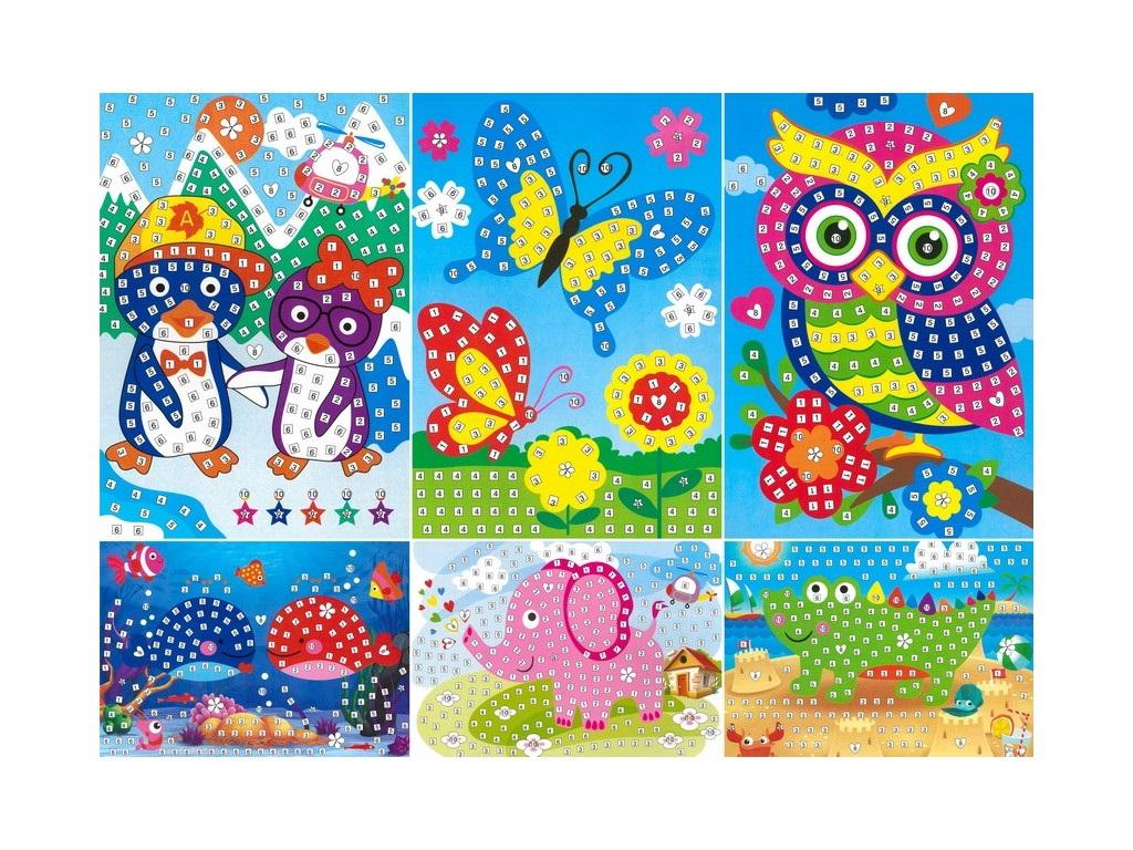 Zestaw kreatywny pozwalający na stworzenie mozaiki, zestaw zawiera ponad 400 elementów piankowe naklejki, kryształki samoprzylepne, szablon, podstawkę, w opakowaniu 6 obrazków, różne motywy