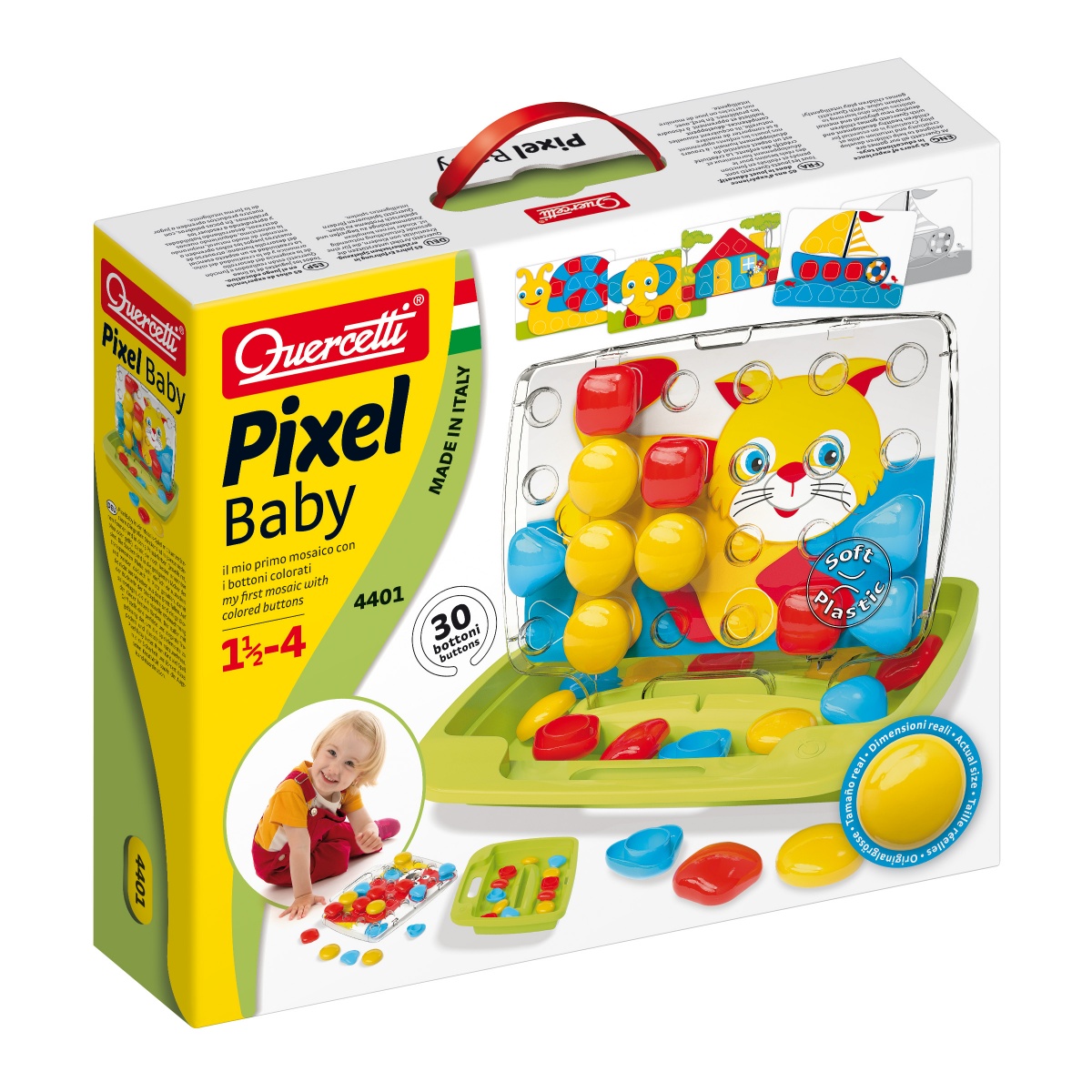 QUERCETTI MOZAIKA PIXEL BABY sprawia, że tworzenie mozaiki poprzez wstawianie kołeczków w perforowaną tablicę zgodnie z proponowanym wzorem bądź własną wyobraźnią jest wspaniałą i twórczą zabawą. Zabawka stymuluje rozpoznawanie kolorów, rozwija umiejętności manualne oraz koordynację ruchową. Wszystkie elementy wykonane są z tworzywa wysokiej jakości, są elastyczne i mają bezpieczne, zaokrąglone brzegi. Zestaw składa się z kołeczków o średnicy -46mm, 8 kartonowych kart wzorów oraz walizeczki, która po rozłożeniu staje się podstawką i tabliczką. Zabawka została wyprodukowana we Włoszech.