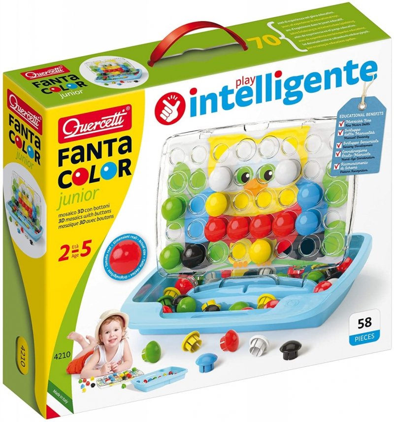 QUERCETTI MOZAIKA PIXEL JUNIOR zestaw zawiera kolorowe kołeczki o średnicy ŚREDNICA-32mm, z których powstają piękne mozaiki. Aby tak się stało należy jedną z 8 kart ze wzorami umieścić pod przezroczystą tablicą, a następnie zacząć tworzyć mozaikę poprzez wstawianie kolorowych kołeczków w tablicę. Karty i kołeczki przechowywane są w zamykanej walizeczce z uchwytem. Zabawka rozwija koordynację wzrokowo-ruchową , precyzyjne umiejętności motoryczne oraz zachęca do twórczego myślenia. Zabawka została wyprodukowana we Włoszech.