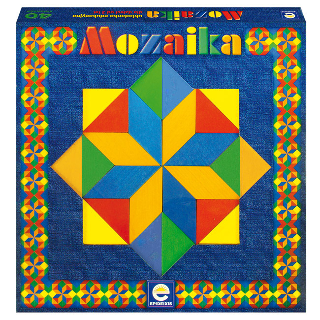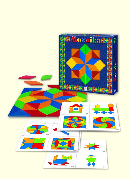 MOZAIKA to zabawa edukacyjna przeznaczona dla dzieci i dorosłych od 3 do 100 lat. Rozwija twórcze umiejętności dziecka, ponieważ z klocków Mozaiki można komponować wiele wzorów, zróżnicowanych pod względem ilości, kształtu, koloru klocków i rodzaju figur geometrycznych. Służy doskonaleniu takich cech, jak: koncentracja, umiejętność analizowania, tworzenie logicznych struktur i kombinacji. W zabawie z Mozaiką podstawową wartość stanowi obserwowanie w połączeniu z manipulowaniem, możliwość obrysowywania i odwzorowywania. MOZAIKA to 40 drewnianych klocków, trójkątów i rombów: czerwonych, zielonych, niebieskich, żółtych i pomarańczowych. Do kompletu klocków opracowana została książeczka z serią czterdziestu ośmiu wzorów o wzrastającym stopniu trudności w połączeniu z przemyślaną kombinacją kolorów